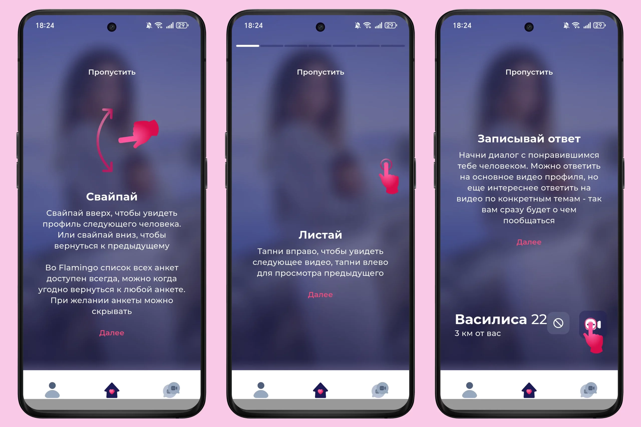 Flamingo — это нестандартный сервис в нашем рейтинге приложений для знакомств. В этом приложении полностью отсутствуют классические функции: здесь нет обычных лайков, свайпов по профилям и длинных переписок. Вместо этого люди записывают короткие видеоролики о себе и смотрят видео других пользователей.