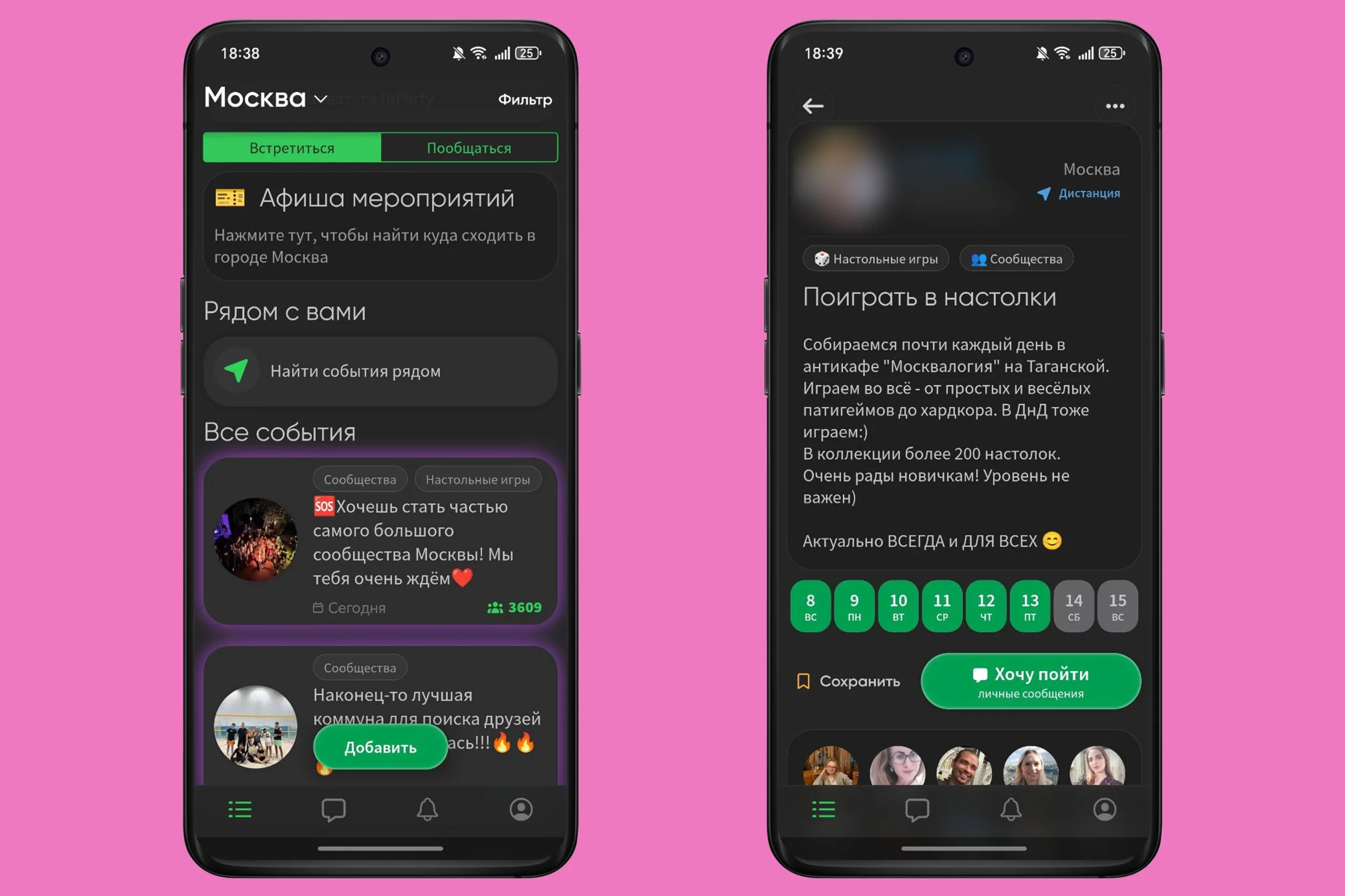 Если вы не знаете, какое приложение для знакомств лучше для поиска друзей, то обратите внимание на InParty. Это приложение не столько про романтические знакомства, сколько про поиск друзей и живого общения. Поиск знакомств здесь устроен через два основных раздела. Первый — «Встретиться», в котором пользователи создают и находят конкретные события: прогулки, походы в бары и кафе, вечера настольных игр, квесты. Второй — «Пообщаться». Он рассчитан на онлайн-общение в групповых чатах, объединенных общей темой или интересом.