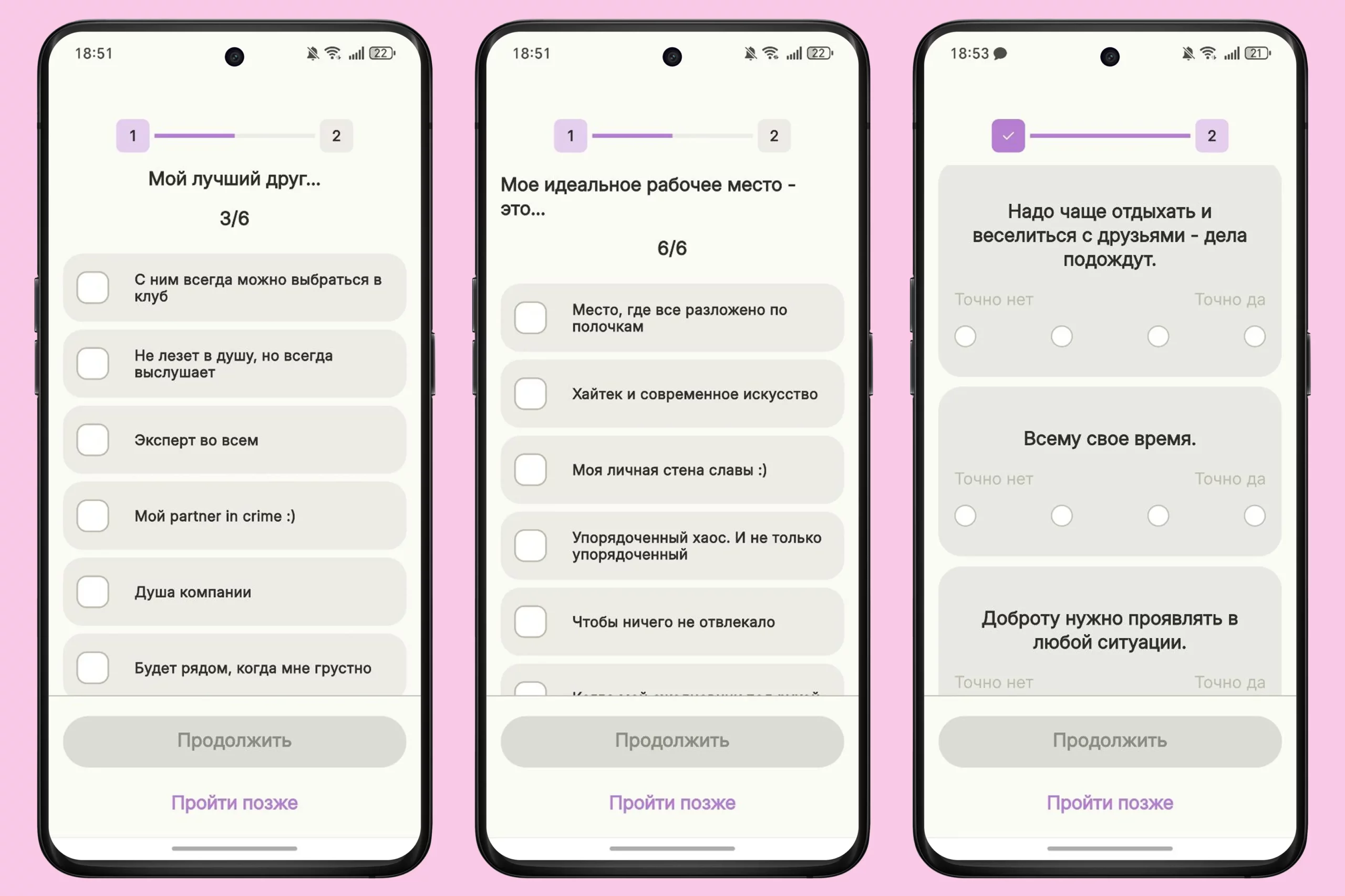 При регистрации пользователям предлагают пройти развернутый психологический тест, чтобы определить тип личности.