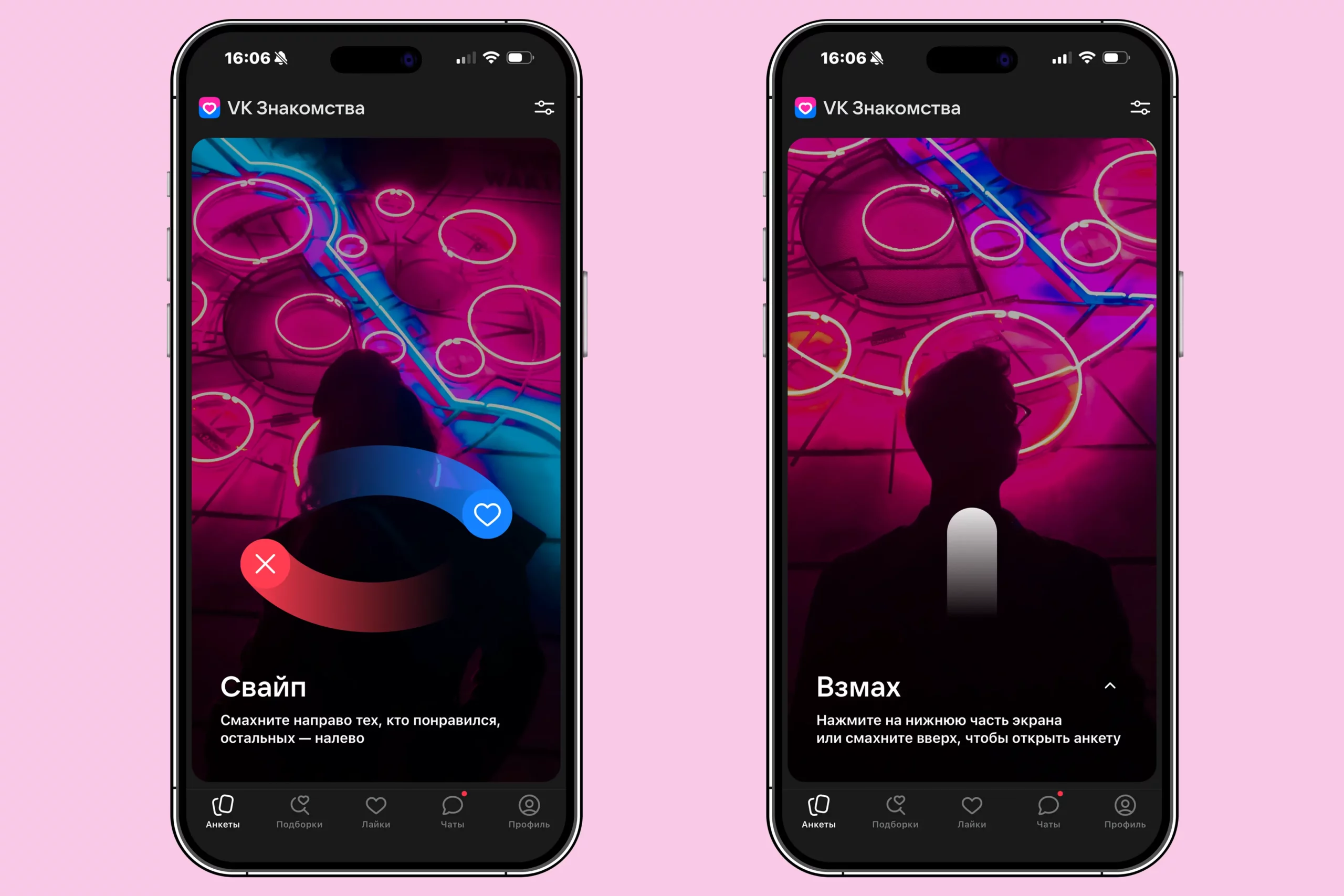 В подборку попадают анкеты людей, которые схожи с вами по интересам, местоположению или активности в приложении. Если анкета нравится — свайпайте вправо. Если нет — влево. Чтобы посмотреть анкету подробнее, нужно смахнуть снизу вверх.