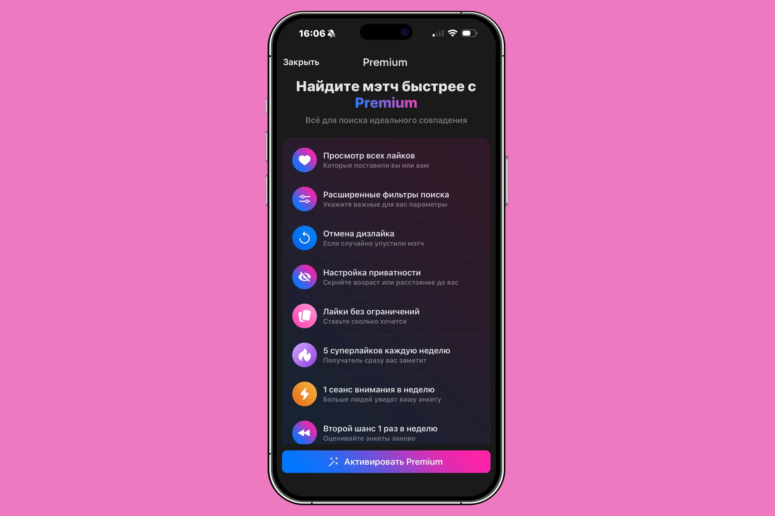 Также доступна премиум-подписка, покупка которой открывает возможность пользоваться дополнительными плюшками: лайками без ограничений, отменой дизлайка, расширенными настройками приватности и многим другим.