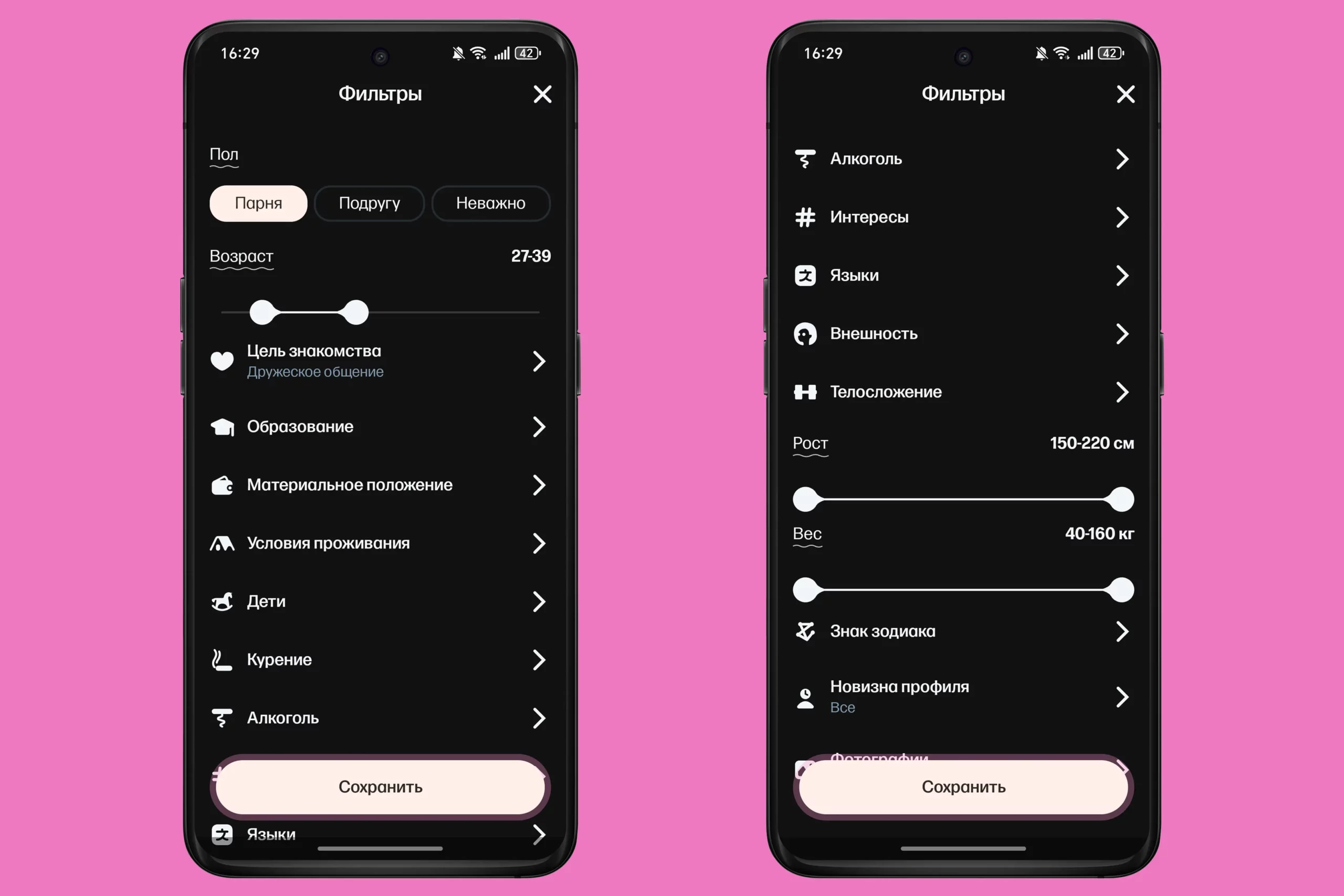 Найти подходящих пользователей можно с помощью фильтров, интерфейс чатов открывается после взаимного лайка. Коммьюнити «Пьюра» определяет свои принципы как свободу и открытость новому, но конфиденциальность тоже важна: откровенные фото приложение скрывает настройками приватности.