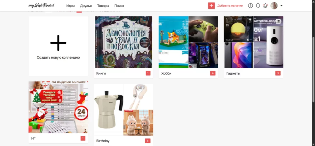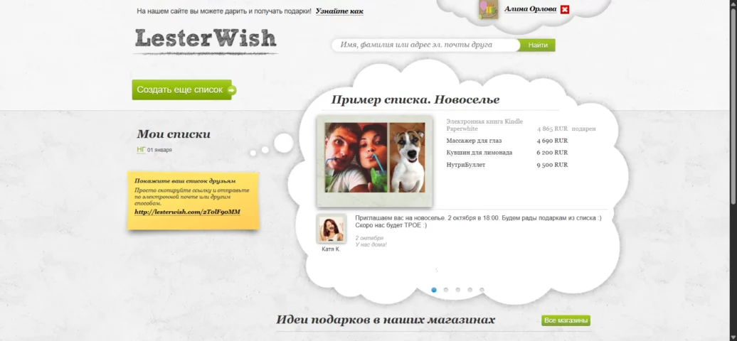 Один из самых дружелюбных и ярких вишлистов, похожий на соцсеть. В нем можно составить тематические списки желаний, чтобы было удобнее ориентироваться, а на главной странице есть подборки идей других пользователей, где можно подглядеть что-нибудь интересное для себя.