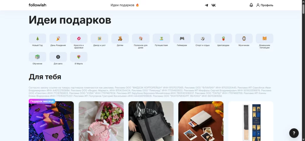 Стоимость: основной функционал бесплатный; кастомизация и настройка степени желаемости подарка — от 58 руб/мес.
