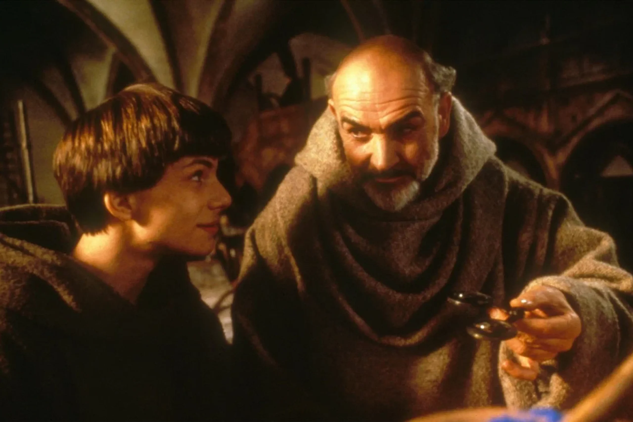Ученый францисканец Вильгельм и его юный ученик, послушник Адсон, прибывают в удаленное бенедиктинское аббатство на богословский диспут, а попадают к расследованию череды загадочных смертей. Герой Вильгельм Баскервильский — сознательная отсылка к Конан Дойлу. Картина поставлена по роману Умберто Эко.