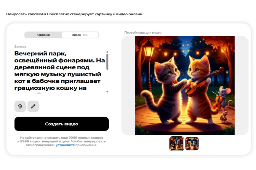 Сервис предлагает создать короткий клип: генерирует несколько вариантов первых кадров, затем соединяет их в ролик длиной 4 секунды с 24 fps. Все происходит в браузере — без установок и ожиданий. Из приятного — поддержка русского языка в промптах, быстрая анимация на основе загруженной картинки или текста и интегрированная соцсеть (можно делиться и оценивать чужие ролики). На сайте можно создать 20 первых кадров и 10 видеогенераций в день, а с подпиской «Яндекс Плюс» их количество увеличивается до 10 000! В приложении вообще нет ограничений на генерацию. Нейросеть бесплатная, а с подпиской ПРО повышается качество создаваемого контента: можно делать ролики в 4К, генерация происходит быстрее, полученные кадры можно использовать в коммерческих целях