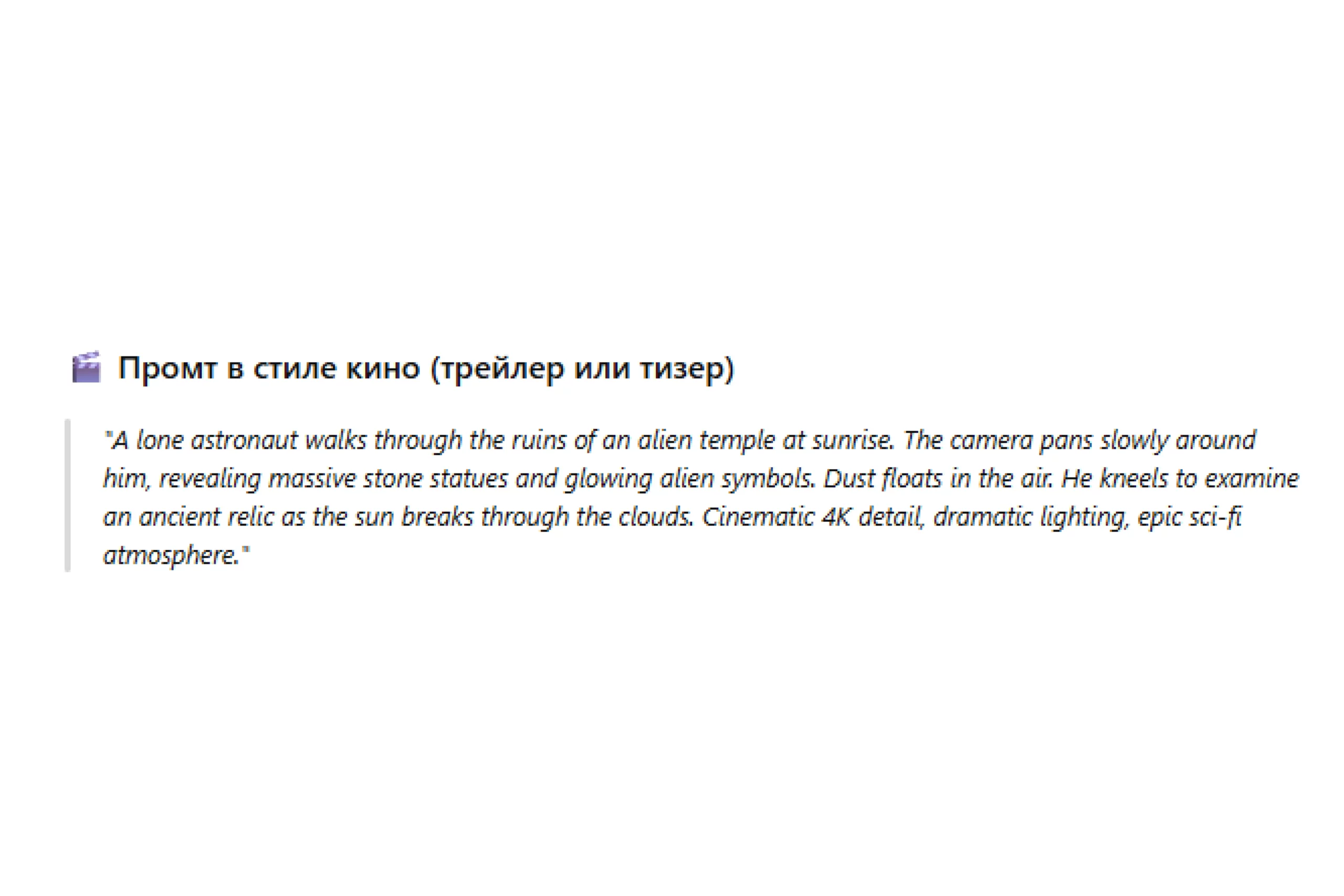 Чтобы сгенерировать видео, нужно составить хороший промпт, то есть текстовый запрос с описанием сцены — все как с обычными нейросетями. На официальном сайте есть примерные промпты, которые наглядно демонстрируют, как и что можно запросить у нейросети.