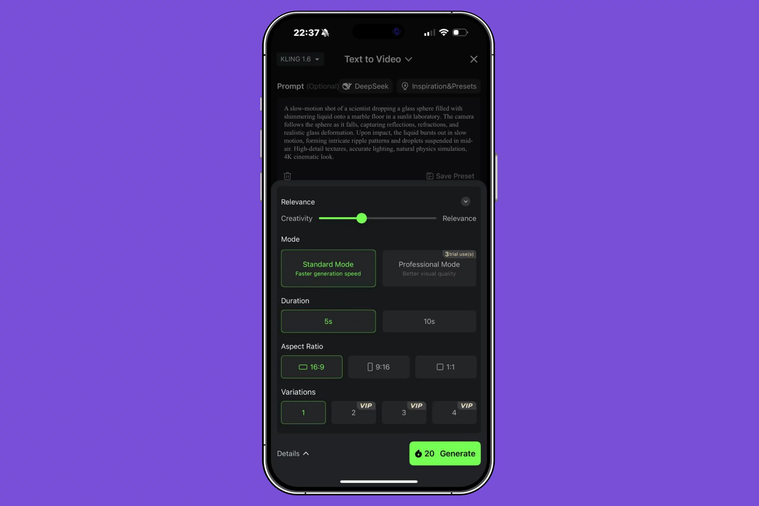 - Пока есть возможность генерить видео с разрешением 720р или 1080р. Разрешение 4К недоступно для рядовых пользователей.