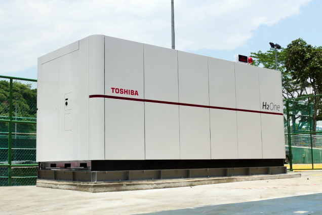 Несколько лет назад Toshiba создала мобильную электростанцию H2One, преобразующую обычную пресную воду в водород, а его — в энергию. В качестве источника энергии для преобразования используются солнечные батареи и аккумуляторы. H2One способна производить за час 2 кубометра водорода или 55 кВт энергии. Источник: Toshiba ESS