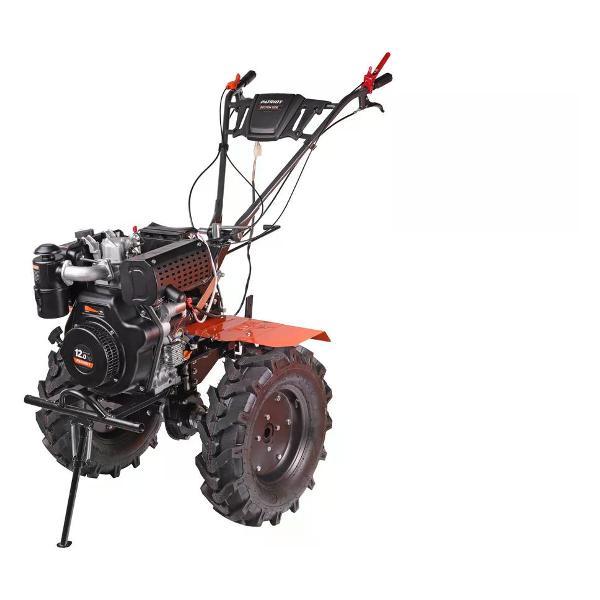 В нашем топе лучших мотоблоков этот — рекордсмен по мощности (12 л. с.). Он идеален для участков от 30 соток и фермерских хозяйств. Регулируемый руль позволяет настроить управление под рост оператора, снижая усталость при длительной работе, а электростартер упростит запуск дизельного двигателя. Чугунный шестеренчатый редуктор и усиленная рама добавляют надежности.