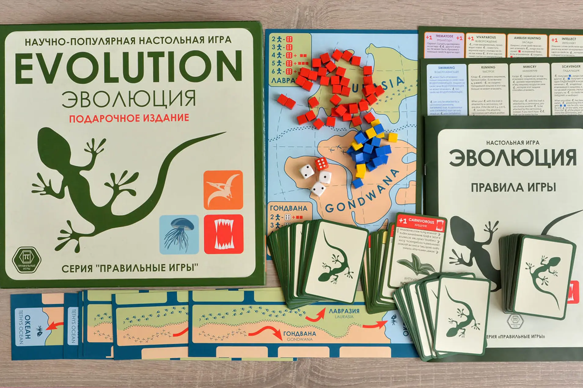 Карточная игра для 2−6 игроков, в которой надо создавать и развивать свои виды животных, параллельно нападая на животных конкурентов. Эволюция — это безжалостная борьба за ограниченные ресурсы в изменяющихся условиях окружающей среды.
