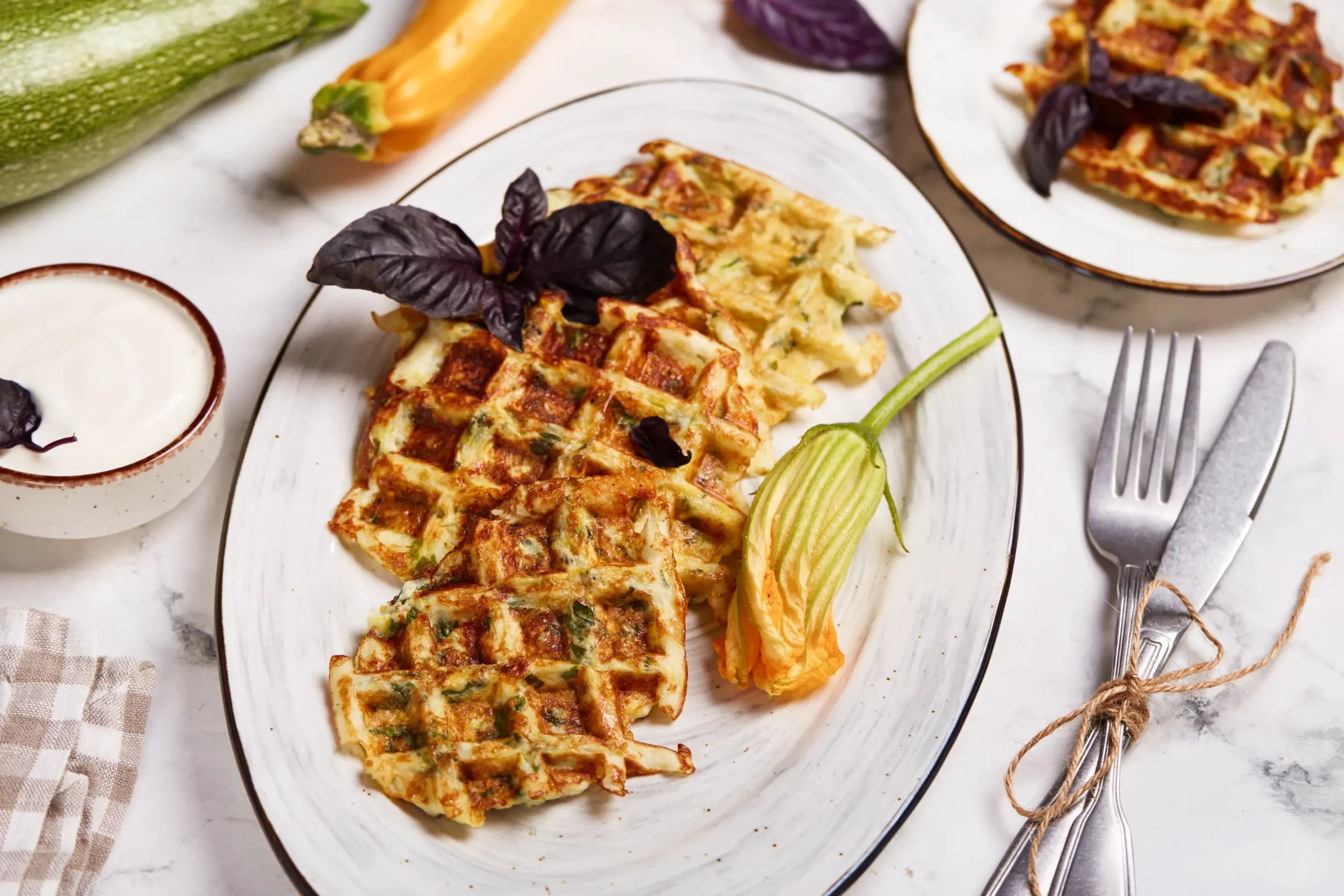 Кабачок натирается на крупной терке, присыпается солью и через десять минут отжимается — иначе тесто будет жидким. Яйца взбиваются со сметаной, к ним добавляют муку с разрыхлителем, а потом кабачковую массу, сыр и чеснок. Консистенция должна напоминать тесто для оладий. Вафельницу достаточно смазать маслом и выпекать вафли по 4−5 минут до румяной корочки. Подавать их вкуснее всего с чесночным соусом или густым йогуртом.