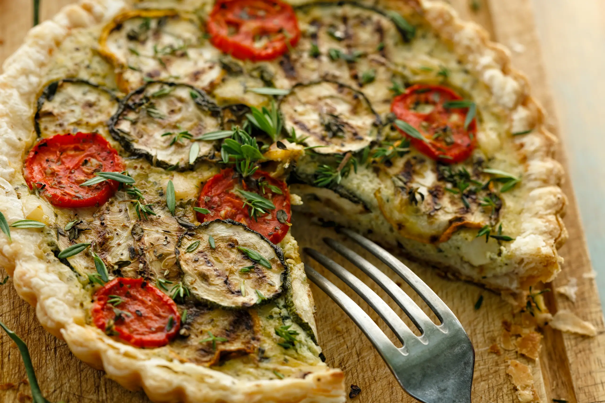 Кабачок нарезается тонкими кружочками, а томаты — дольками. Овощи выкладываются на основу внахлест, образуя красивый узор. Сверху все это заливается яично-сметанной смесью и отправляется в духовку примерно на 35 минут. На стол такой тарт лучше подавать слегка остывшим: его легче нарезать, а вкус раскрывается полнее.