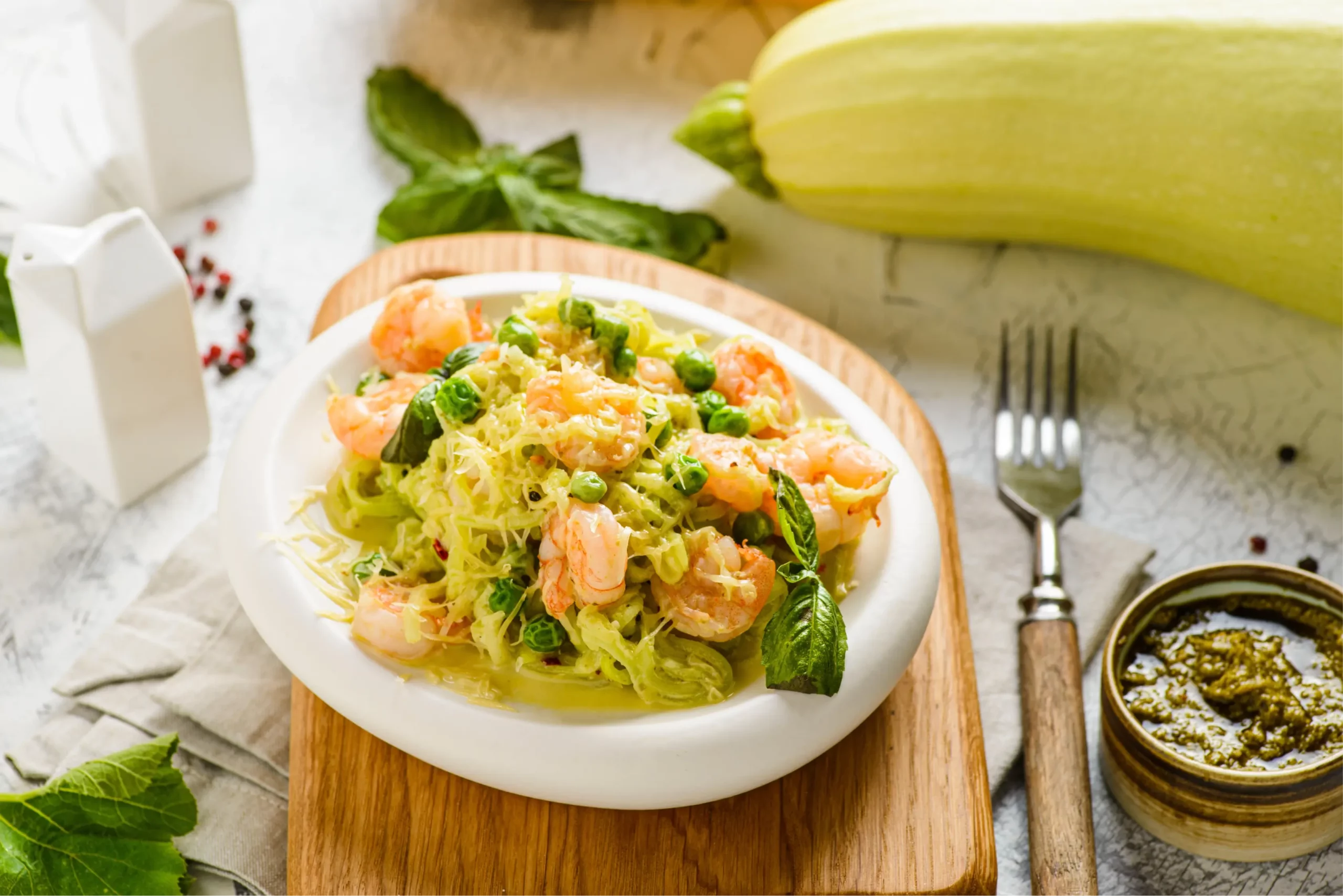 Морепродукты и кабачок прекрасно сочетаются: креветки дают сладковатый вкус, кабачок почти не чувствуется, а на основе сливок получается нежный соус.