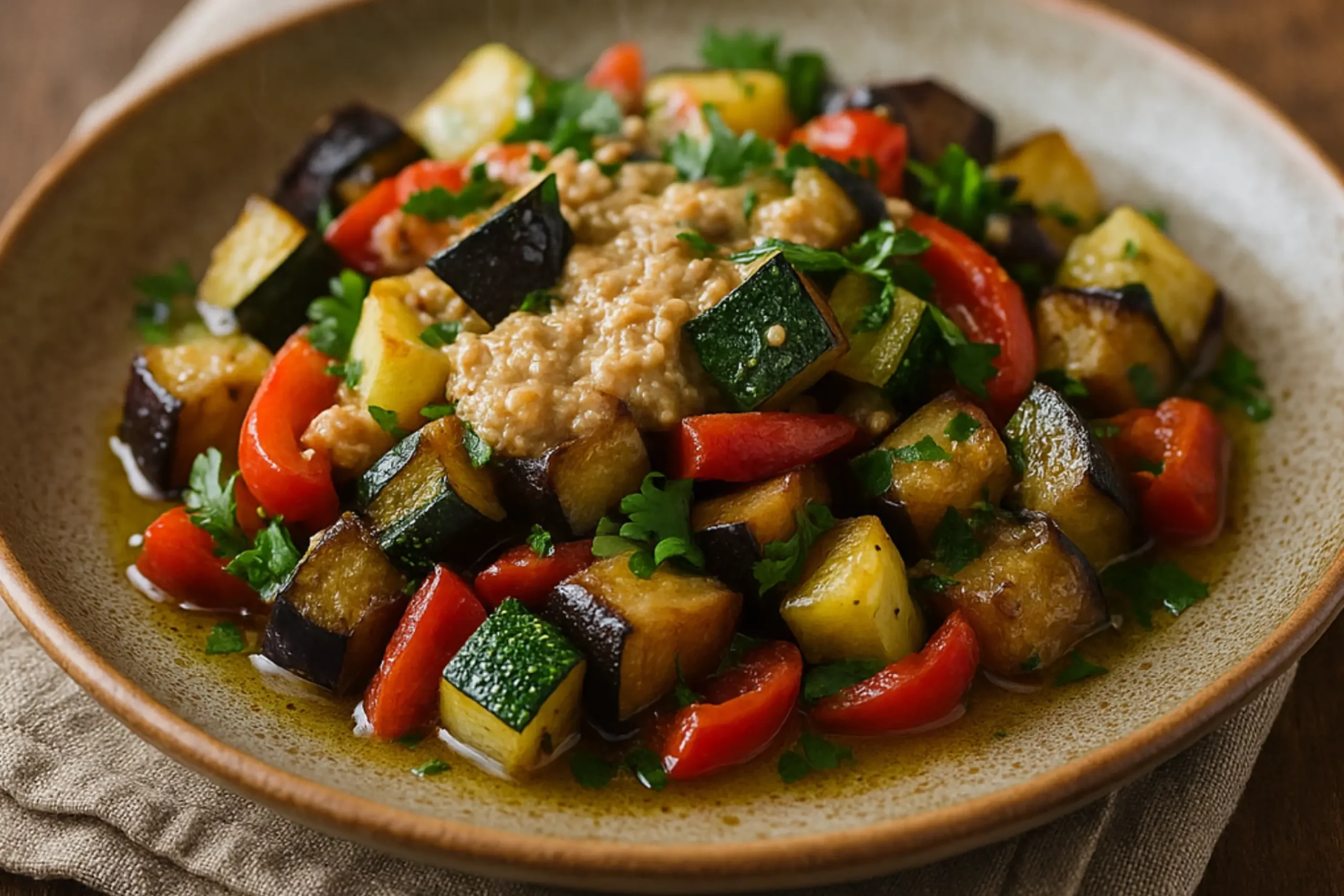 Овощи нарезаются кубиками и быстро обжариваются на оливковом масле. Важно не передержать их. Достаточно, чтобы появилась легкая золотистая корочка. Параллельно готовится соус: орехи перебиваются блендером с чесноком, лимонным соком и солью. Когда овощи станут мягкими, их соединяют с соусом и подают, пока они теплые.