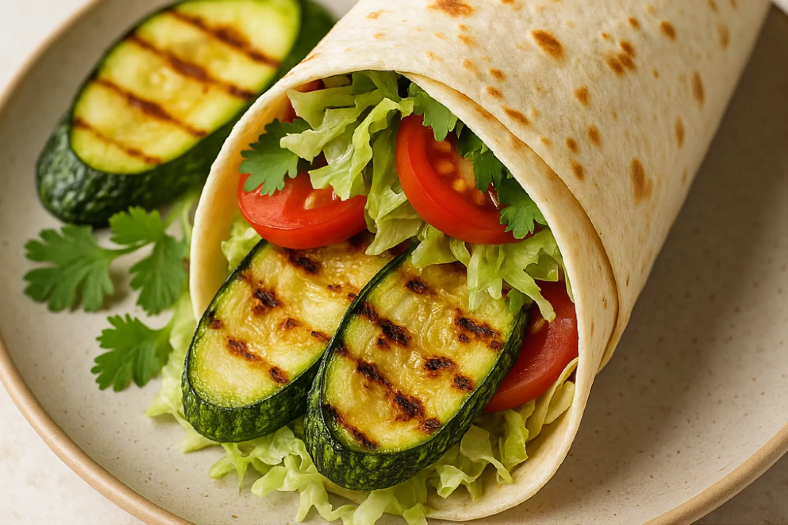 Кабачок натирается и отжимается, к нему добавляют яйцо, хлопья, муку, чеснок и зелень. Из массы формируются котлетки и обжариваются до румяности. Их нужно выложить на лаваш, добавив свежие овощи и соус. Лаваш сворачивают рулетом и прогревают на сухой сковороде до хруста.