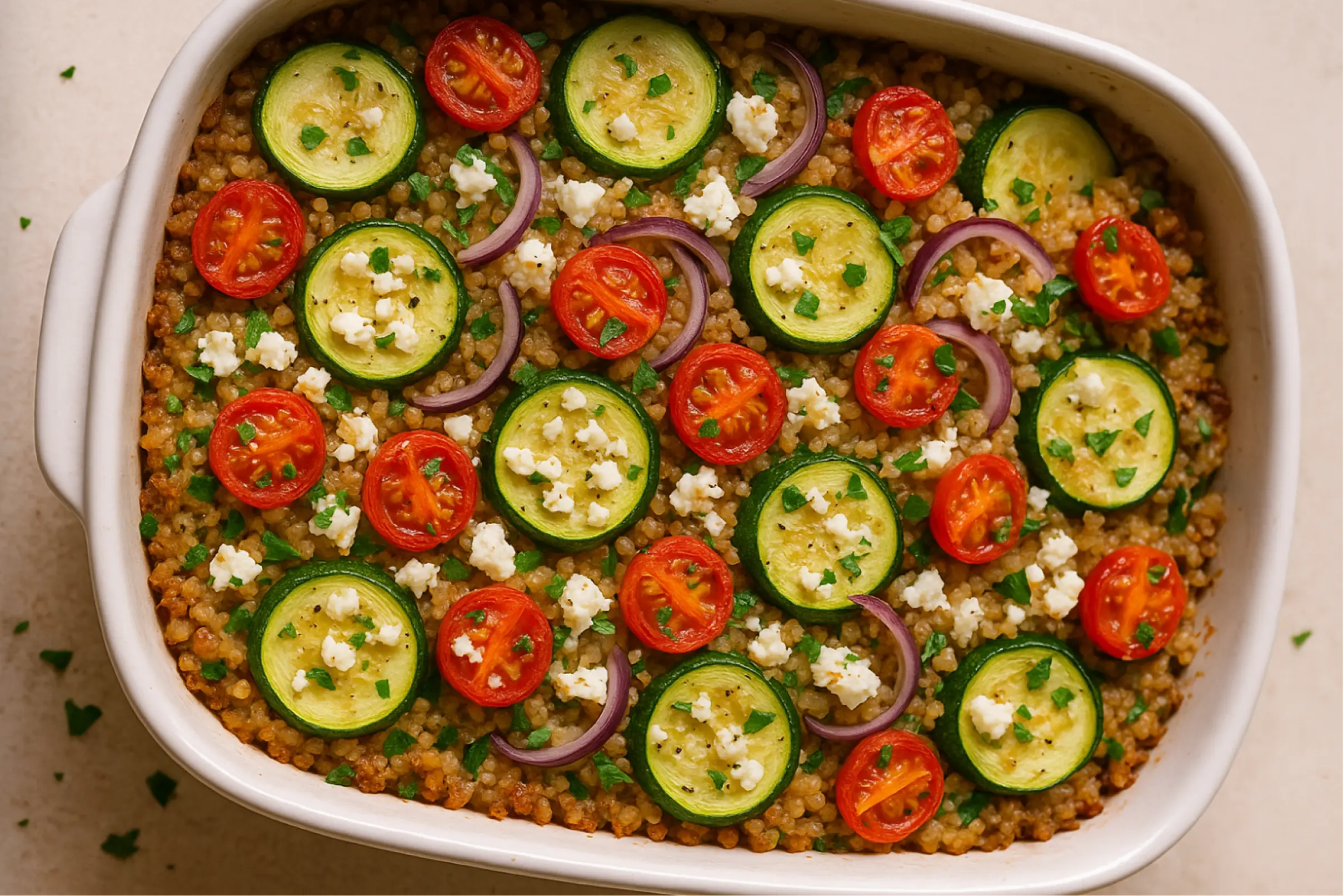 Похоже, мы нашли ответ на вопрос, что можно приготовить из кабачков для семейного ужина. Такое блюдо напоминает легкую средиземноморскую запеканку: кабачки здесь выступают не как гарнир, а как полноценный ингредиент, который отлично дружит с киноа и солоноватой фетой.