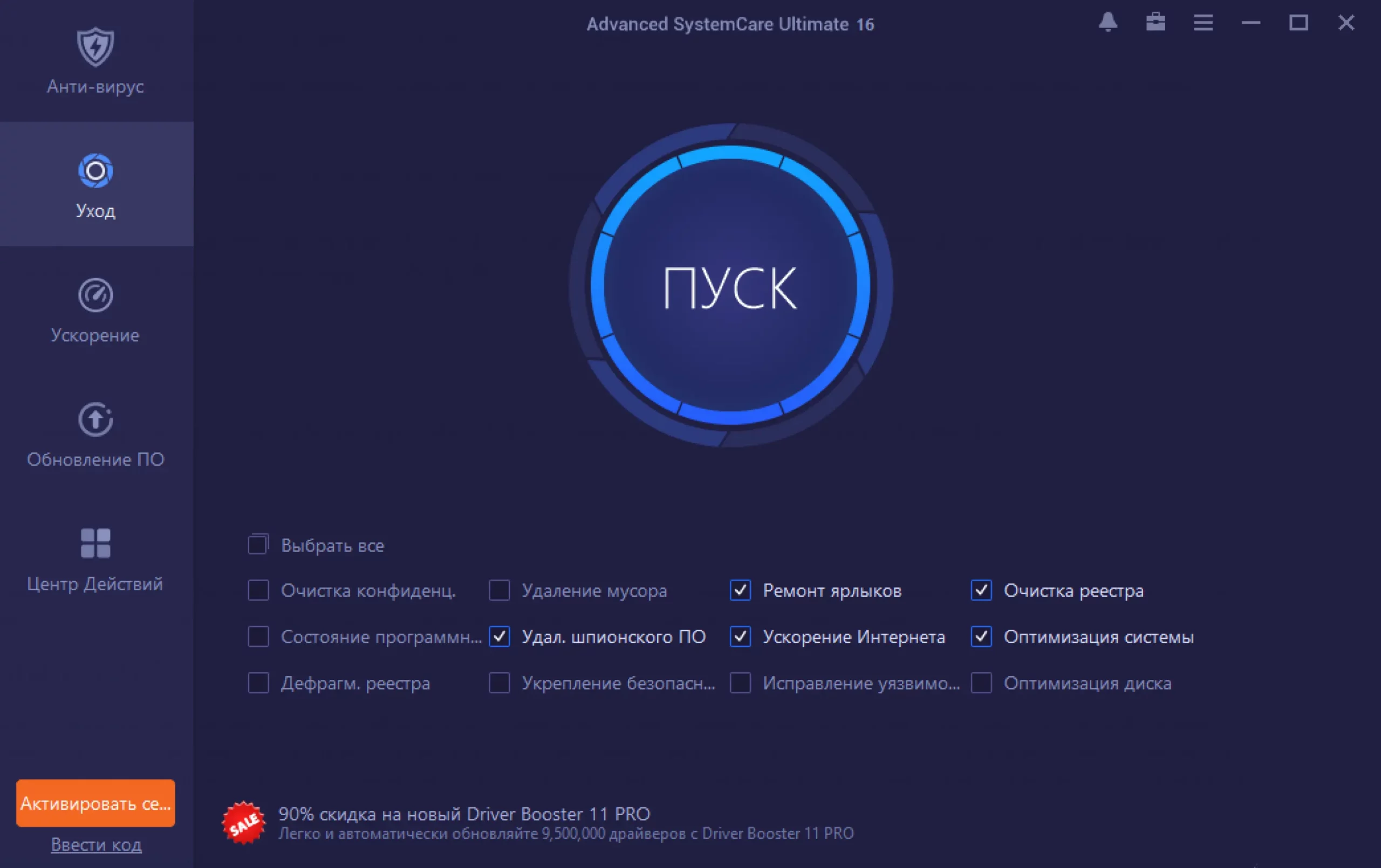 Во вкладке «Уход» можно выбрать очистку и дефрагментацию реестра, исправление неверных ярлыков, удаление конфиденциальных данных и шпионского ПО.