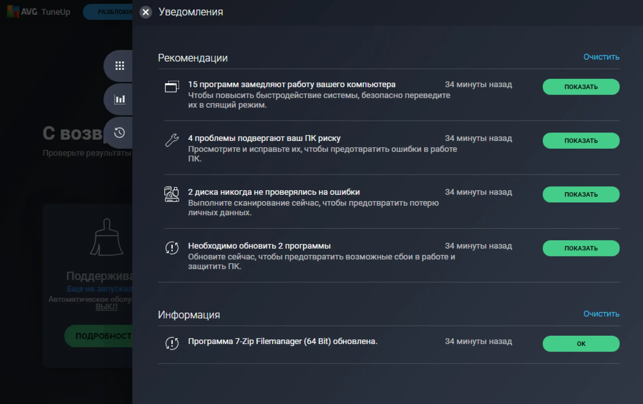 Программа, которую можно считать аналогом CCleaner. Здесь целый пакет утилит для удаления лишних файлов с компьютера и оптимизации системы. AVG TuneUp автоматически анализирует систему, выявляя замедляющие программы, определяя риски для работы ПК и даже нуждающееся в обновлении ПО. Сразу при запуске появляется список рекомендаций.