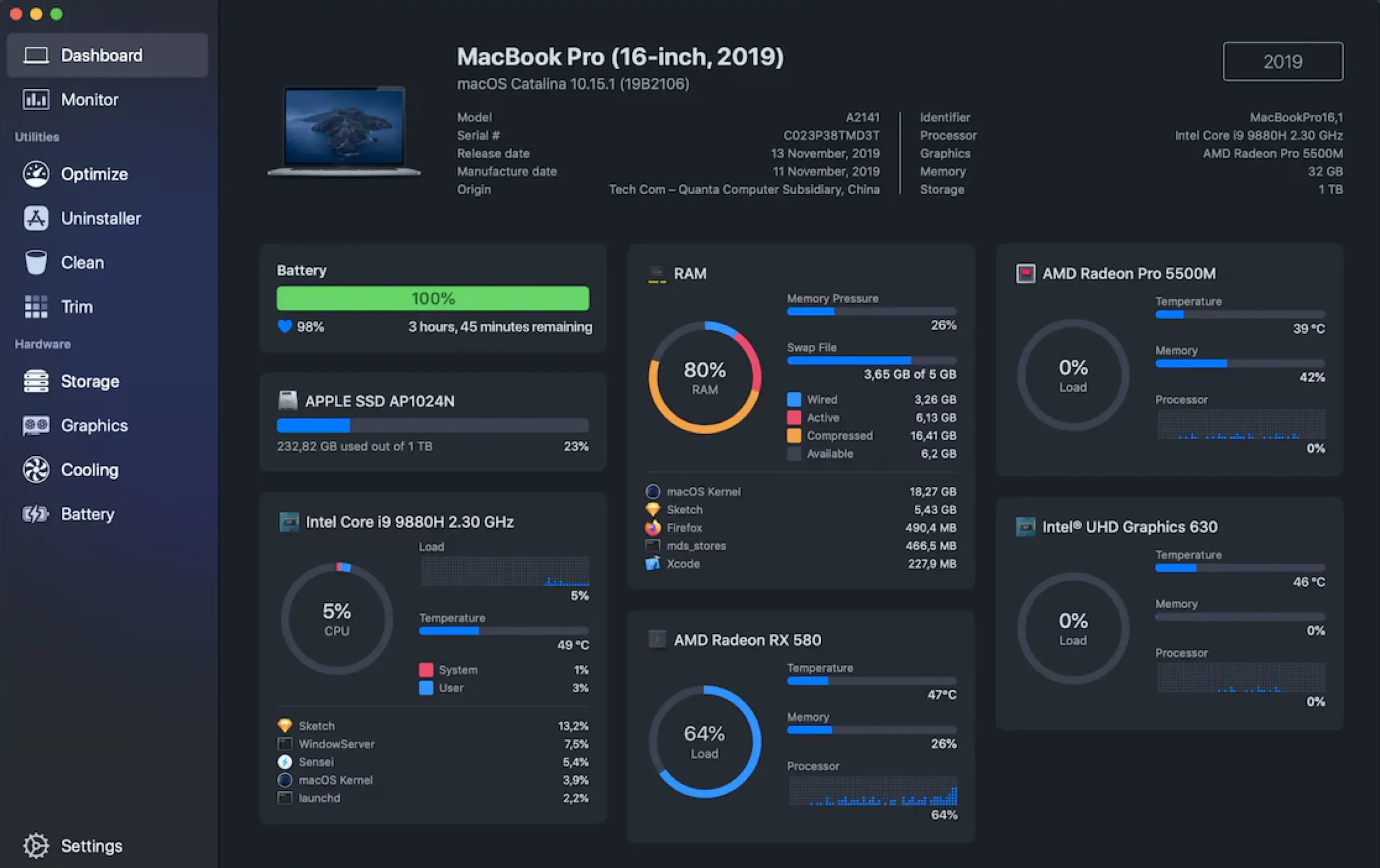 Пользовательский интерфейс простой и понятный. На самой верхней вкладке Dashboard можно ознакомиться с состоянием заряда батареи, объемом памяти, интенсивностью работы и температурой компонентов. Отображается и то, какие программы сильнее всего нагружают систему. Monitor — еще более подробная информация о состоянии системы. Можно самому выбрать, какие параметры и как будут отображаться на панели. Есть отдельные виджеты для демонстрации загруженности ядер процессора, наиболее требовательных к ресурсам приложений, занятости оперативной памяти и так далее.