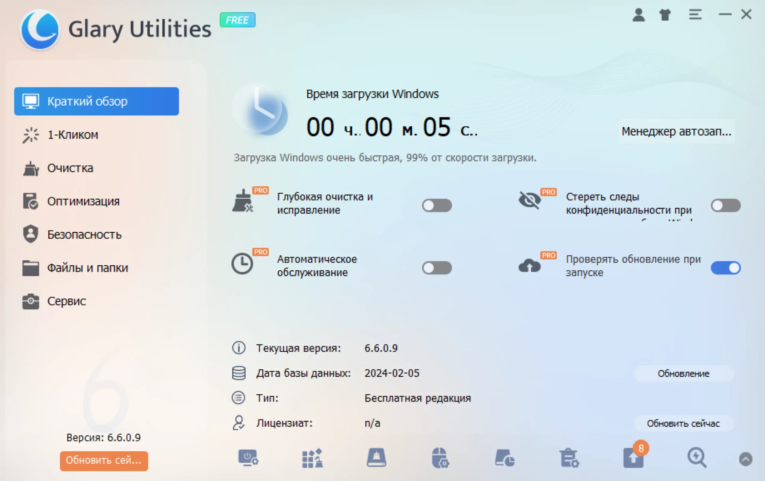 В бесплатной версии доступны все базовые функции. Версия PRO доступна за €19,96. Из преимуществ платного варианта: пользовательская поддержка 24/7, автоматический поиск всех актуальных обновлений и улучшенная оптимизация системы. Хоть приложение и доступно только на английском языке, но в его функциях несложно разобраться.