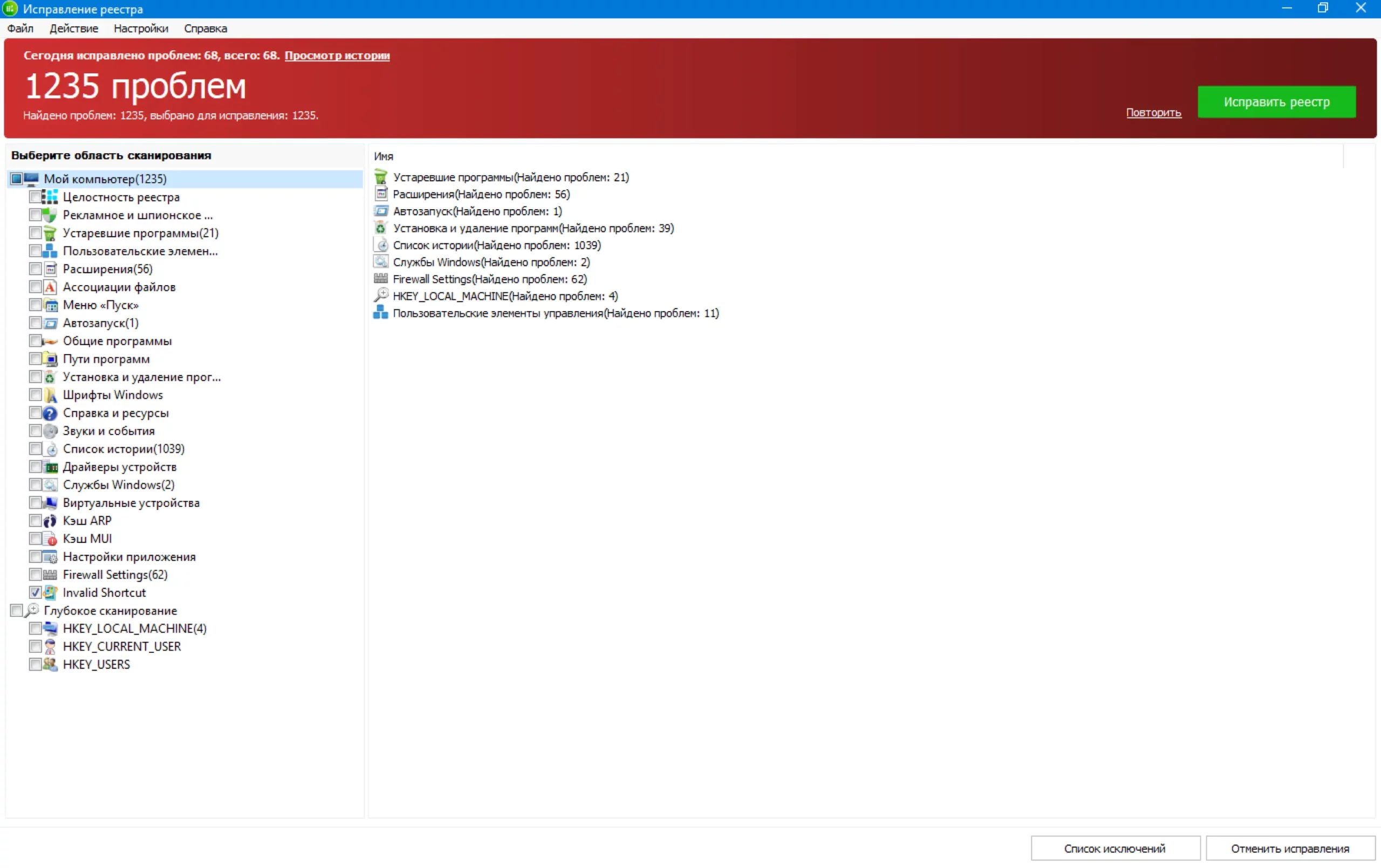 Анализирует десятки областей реестра. Находит недавние файлы, устаревшие программы, виртуальные устройства и все остальное, о чем в реестре сохранились записи. Также Registry Repair позволяет избавиться от записей о настройках приложений, автозапуске, установке программ и использовании расширений.
