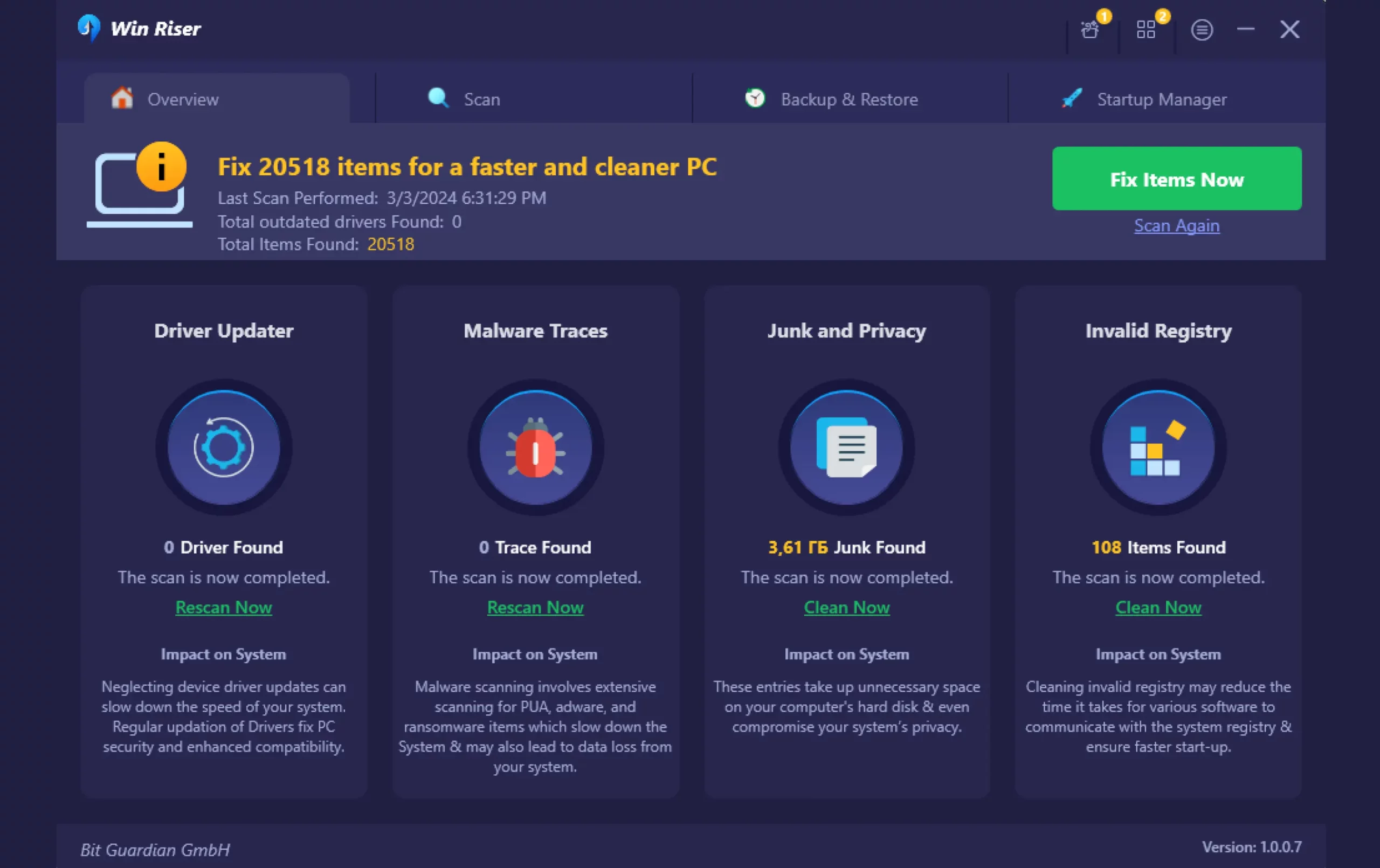 Ультракомпактный аналог CCleaner, Win Riser позволяет не только упростить очистку компьютера, но и обновить программное обеспечение. При запуске программа предлагает просканировать ПК на наличие проблем, которые она способна исправить.