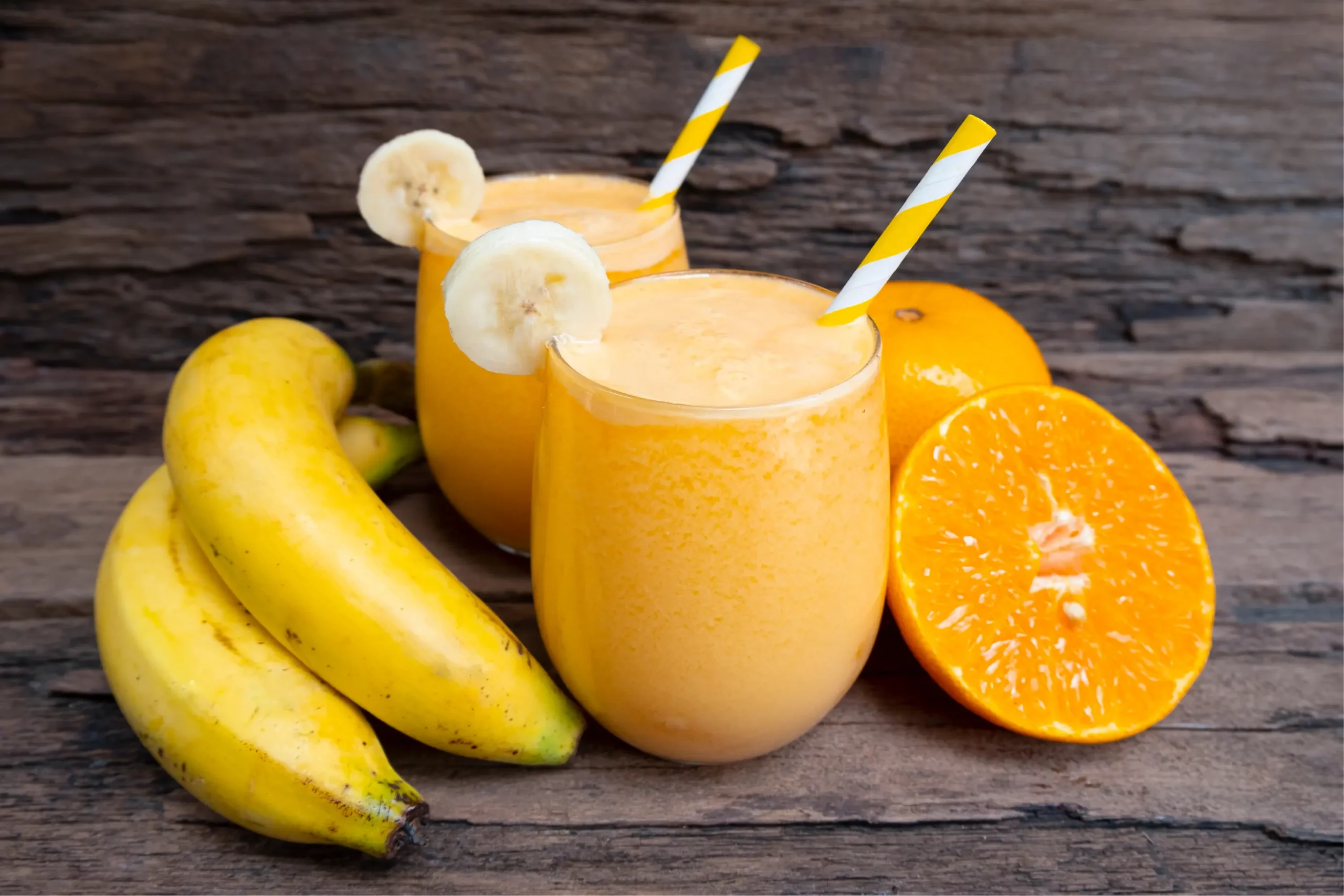 Сок из апельсинов выжмите с помощью соковыжималки. Перелейте его в чашу блендера. Туда же добавьте все остальные ингредиенты. Взбивайте, пока лед не превратится в крошку. Разлейте напиток по бокалам, украшенным ломтиком апельсина или банана.