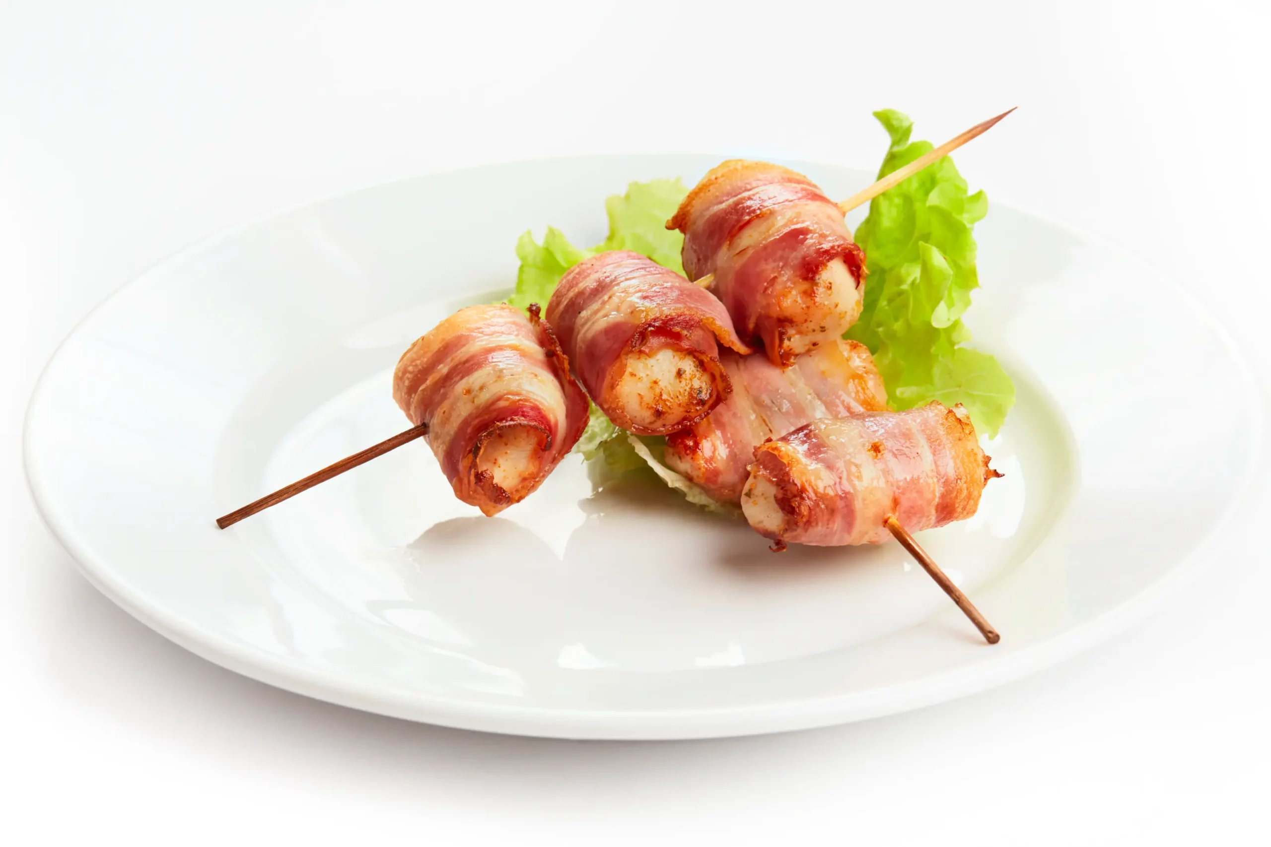 - Обжаривайте шашлыки, часто переворачивая, чтобы бекон не подгорел. При каждом переворачивании обильно смазывайте шашлыки глазурью. Готовьте до появления равномерной золотистой корочки.
