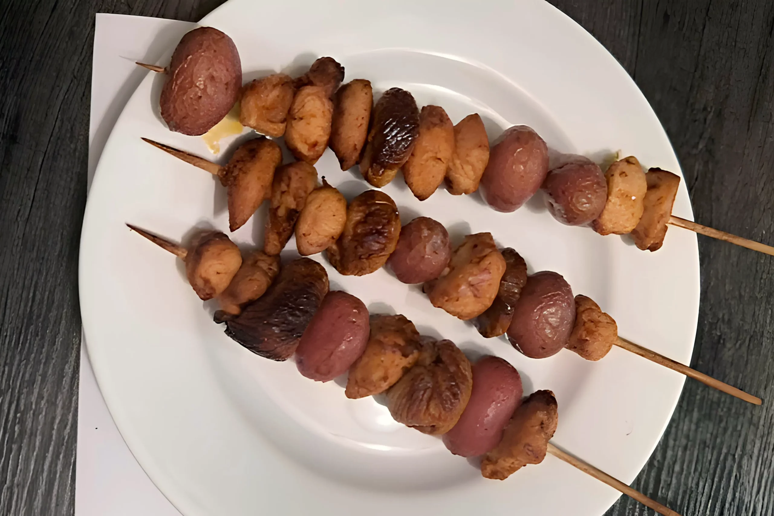 - Готовьте шашлыки на углях, регулярно переворачивая. Обжаривайте курицу до золотистой корочки, а картофель — до мягкости (должен легко прокалываться вилкой).