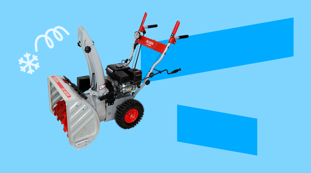 Мощность двигателя 7 л. с. позволяет устройству передвигаться быстро, а резиновые колеса с агрессивным протектором — не скользить на льду. Ширина ковша — 56 см, дальность сброса снега — до 12 м.