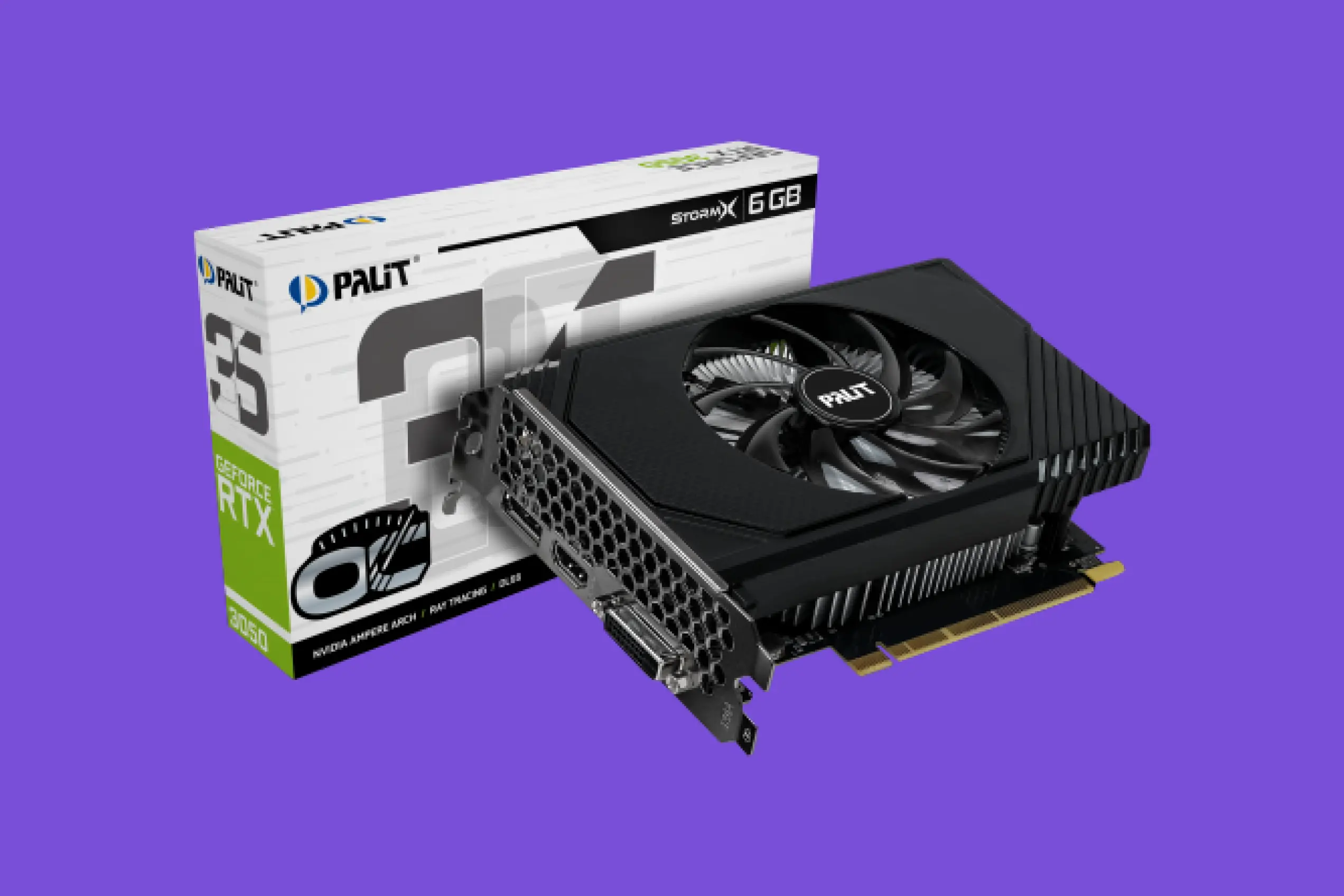 В бюджет сборки влезает только видеокарта Palit NVIDIA GeForce RTX 3050 StormX OC 6GB. У нее одновентиляторная конструкция и нет потребности в дополнительном питании. Решение из категории «вставил и забыл». В целом, с RTX 3050 6 ГБ можно поиграть в современные игры, что было продемонстрировано на примере из сборки 1, но для Core i5-