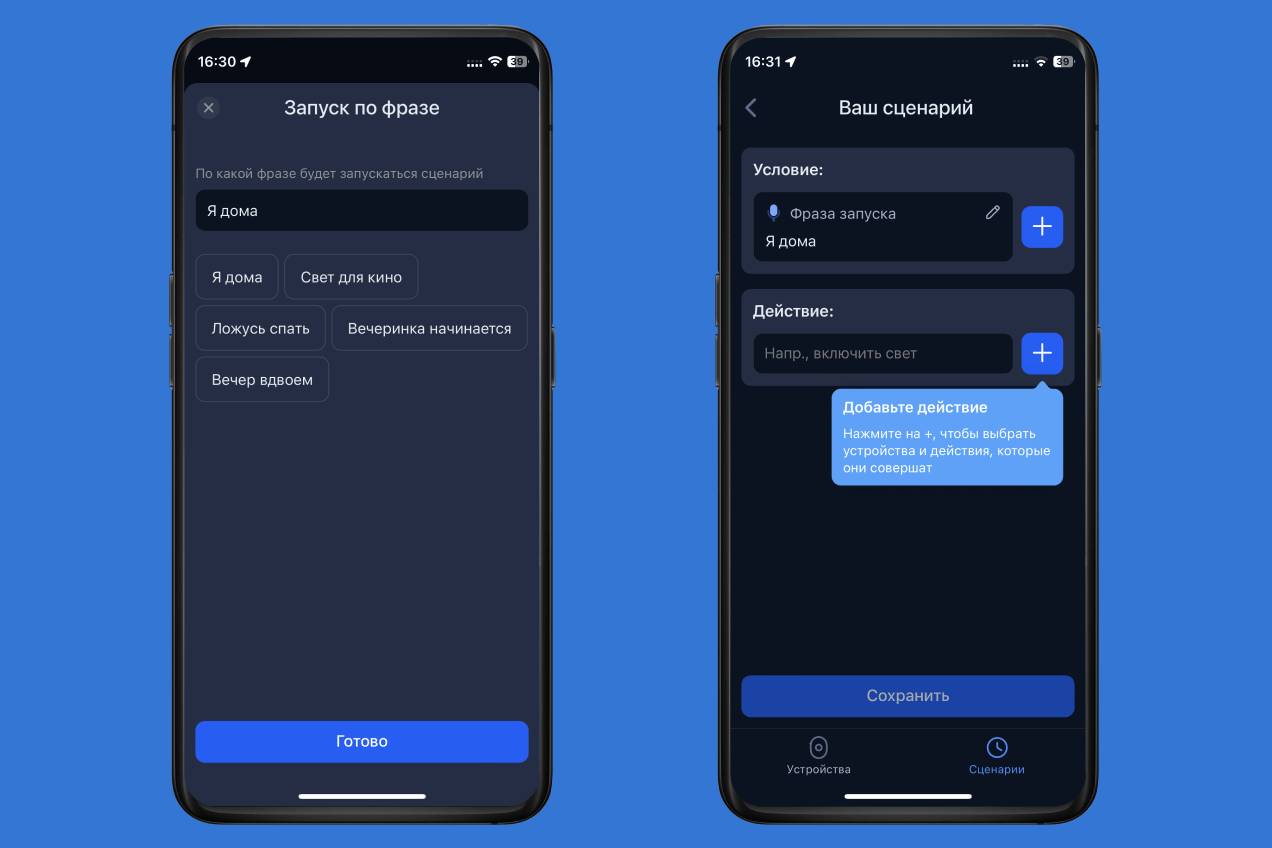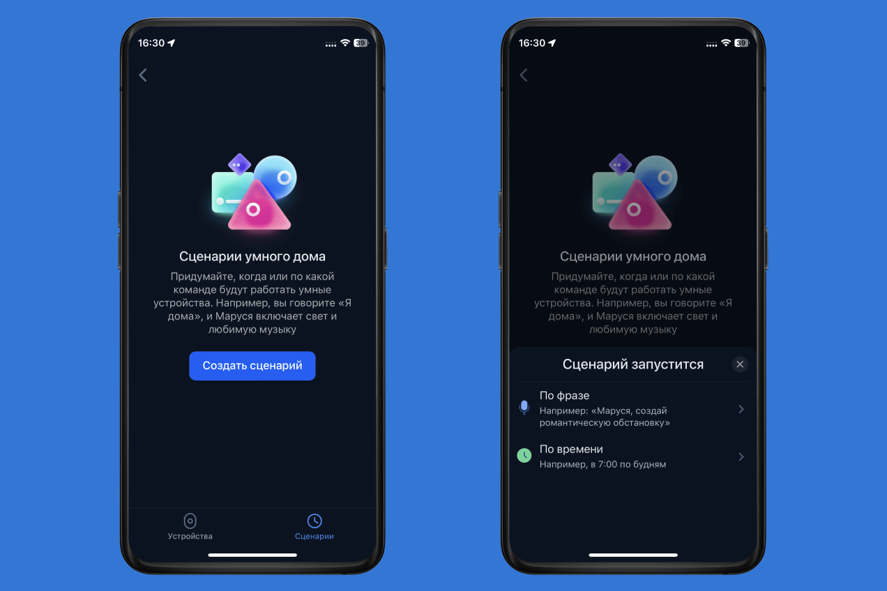 Прежде чем мы перейдем к описанию сценариев умного дома, давайте разберемся, как их настраивать. Так как в большинстве из них участвуют умные колонки, вам понадобится одно из двух приложений: «Маруся» или «Умный дом» от «Яндекса». Ниже покажем, как настроить сценарии для каждого из них.