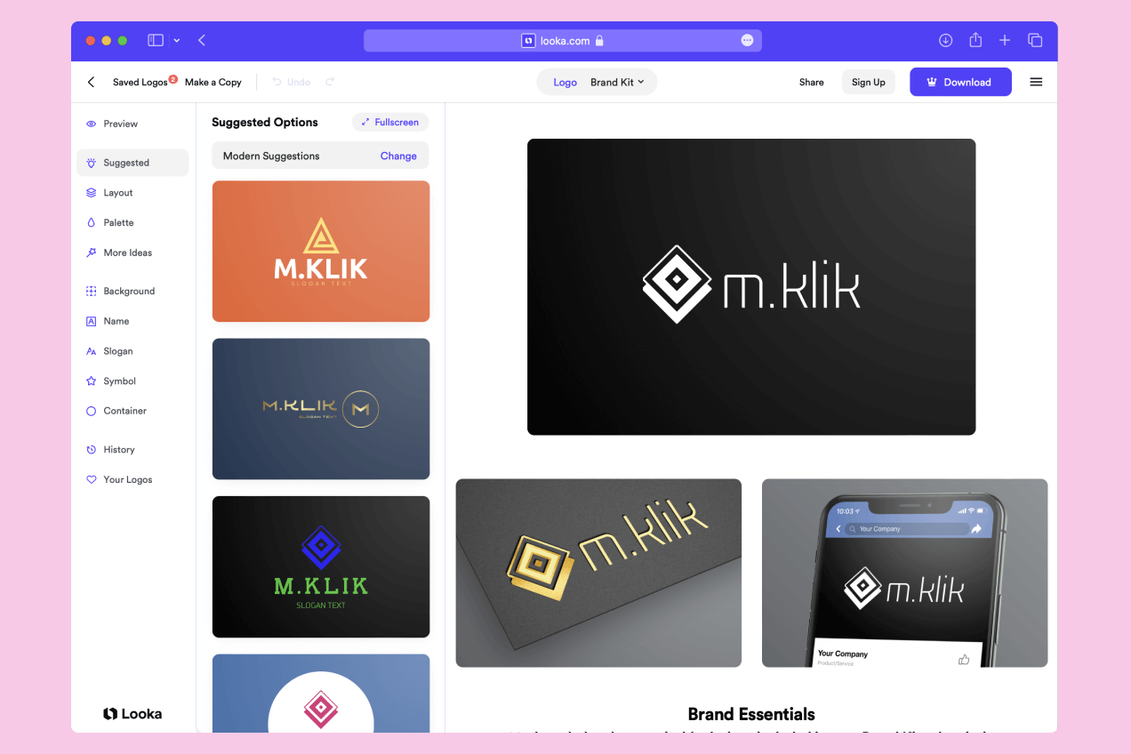 Вы вводите название компании, категорию бизнеса, выбираете референсы из предложенных, цвета и эпитеты, которыми можно описать свой будущий логотип. Дальше немного магии нейросетей — и вот у вас уже собственный уникальный логотип в разных вариациях. Looka работает по очень простому принципу, собирая картинку из элементов, относящихся к выбранным категориям. Получается у нее довольно неплохо (и даже не так безумно, как у ИИ студии Артемия Лебедева).