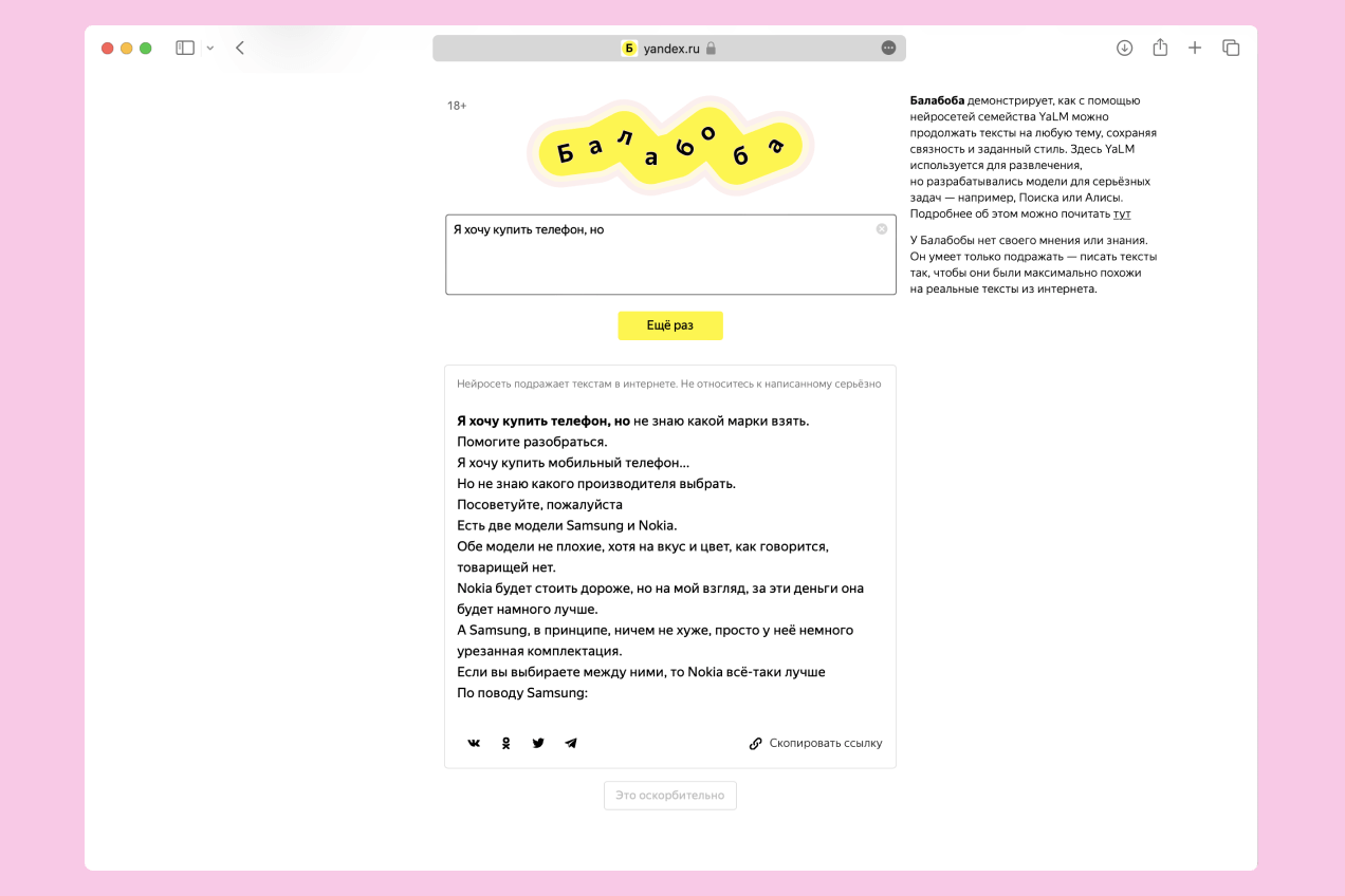 Лень дописывать сообщение? Нужно написать сочинение в университет/школу, но никакие идеи не лезут в голову? Или, может быть, вам нужно составить пацанское поздравление для друга? Тогда вам куда угодно, но не в «Яндекс.Балабобу».