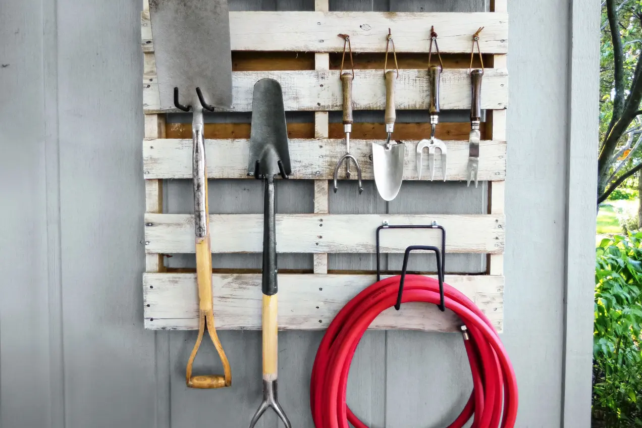 Наведите порядок в кладовке, создав импровизированный органайзер. Для этого закрепите вертикально на стене деревянный поддон. Затем вбейте в него гвозди (или закрутите саморезы) и повесьте крючки. Так вы получите место для хранения крупного инструмента: лопат, граблей, тяпок. На поддоне можно разместить набор инструментов, садовый шланг и элементы декора.