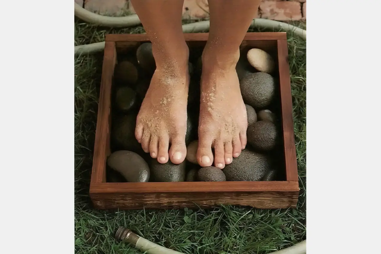 Чтобы не нести пыль и грязь с огорода в дом, воспользуйтесь этим дачным лайфхаком. Возьмите невысокий деревянный ящик и наполните его крупной галькой. Ваша мойка для ног готова! Остается лишь ополоснуть ноги из шланга или ведра и насухо вытереть их.