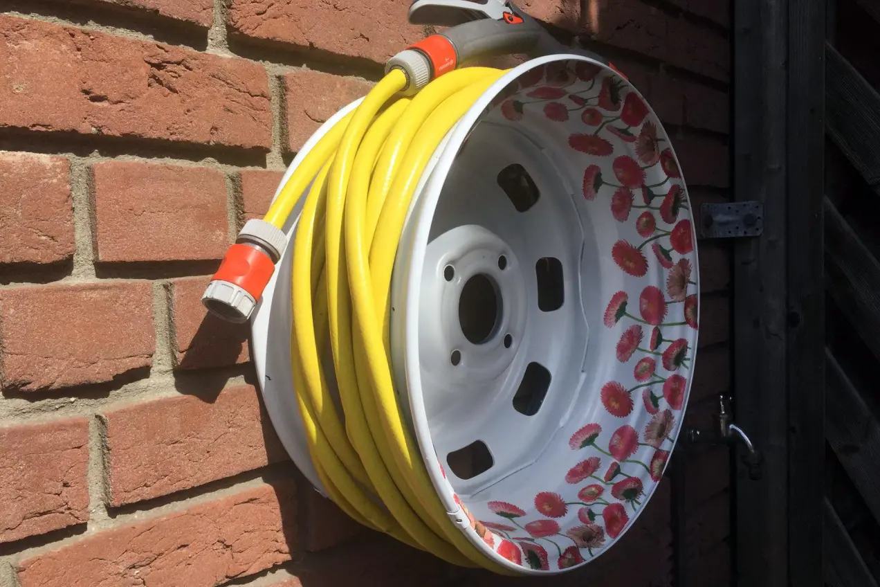 Старый штампованный диск от машины можно сдать в металлолом или приспособить для хранения поливочного шланга. Просто повесьте его на стену и намотайте шланг. А при желании диск будет круто обновить: покрасить краской по металлу, нарисовать узоры или даже установить в нем полку для садовых мелочей.