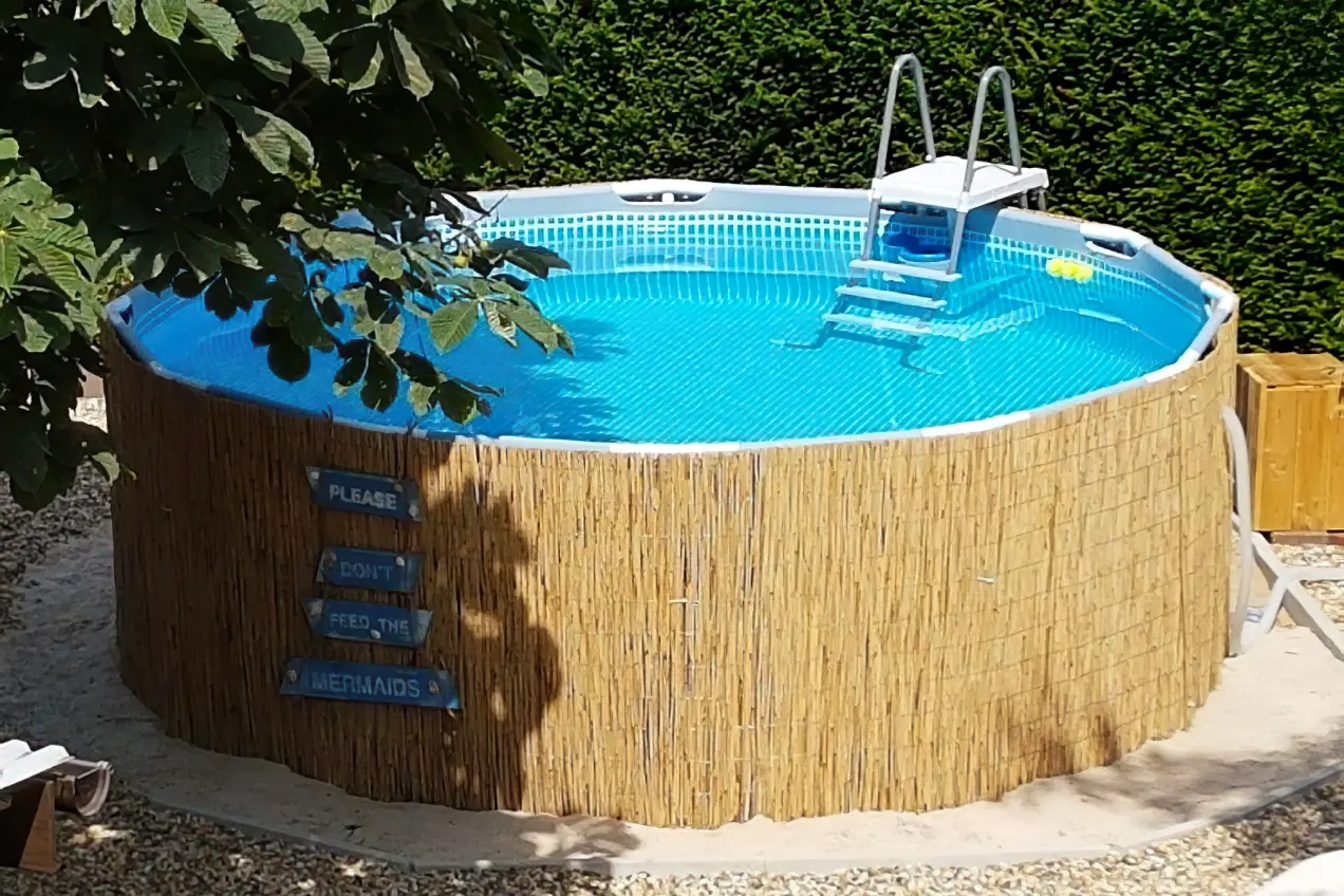 Декорируют борта по-разному: все зависит от вашей фантазии и возможностей. Можно использовать бамбуковые циновки, сплести изгородь из ротанга или посадить по периметру однолетние вьющиеся растения. Рядом устройте зону для отдыха с лежаками и подушками, украсьте все уличными гирляндами — и место для купания засияет по-новому.