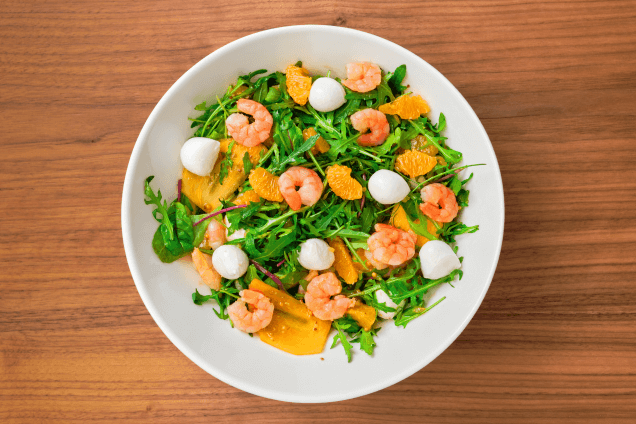 Салат с креветками, хурмой, мандаринами и моцареллой
