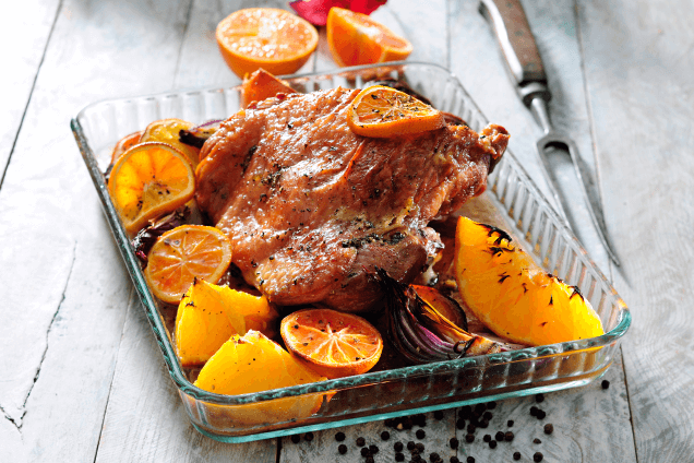 Мясо по этому рецепту получается сочное, с глазированной корочкой и легким цитрусовым ароматом.