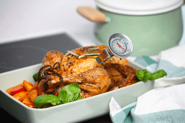 Незаменимая вещь, которая поможет овладеть искусством обжаривания и запекания мяса или птицы без всякой магии. Чтобы мясо приготовилось, необходимо довести его центр до нужной температуры, а длинная игла-щуп такого термометра поможет легко провести измерение точно в центре куска или тушки. Уточнить нужную температуру можно в кулинарных книгах, потому что она различается для разных блюд и степеней прожарки, но на некоторых термометрах уже указаны примерные максимальные значения для разных продуктов. Такой прибор должен быть термостойким, чтобы его можно было помещать в духовку или печь, разогретую до 250 °C, и оставлять там на все время приготовления блюда. Еще один безусловный плюс — возможность мытья в посудомойке.