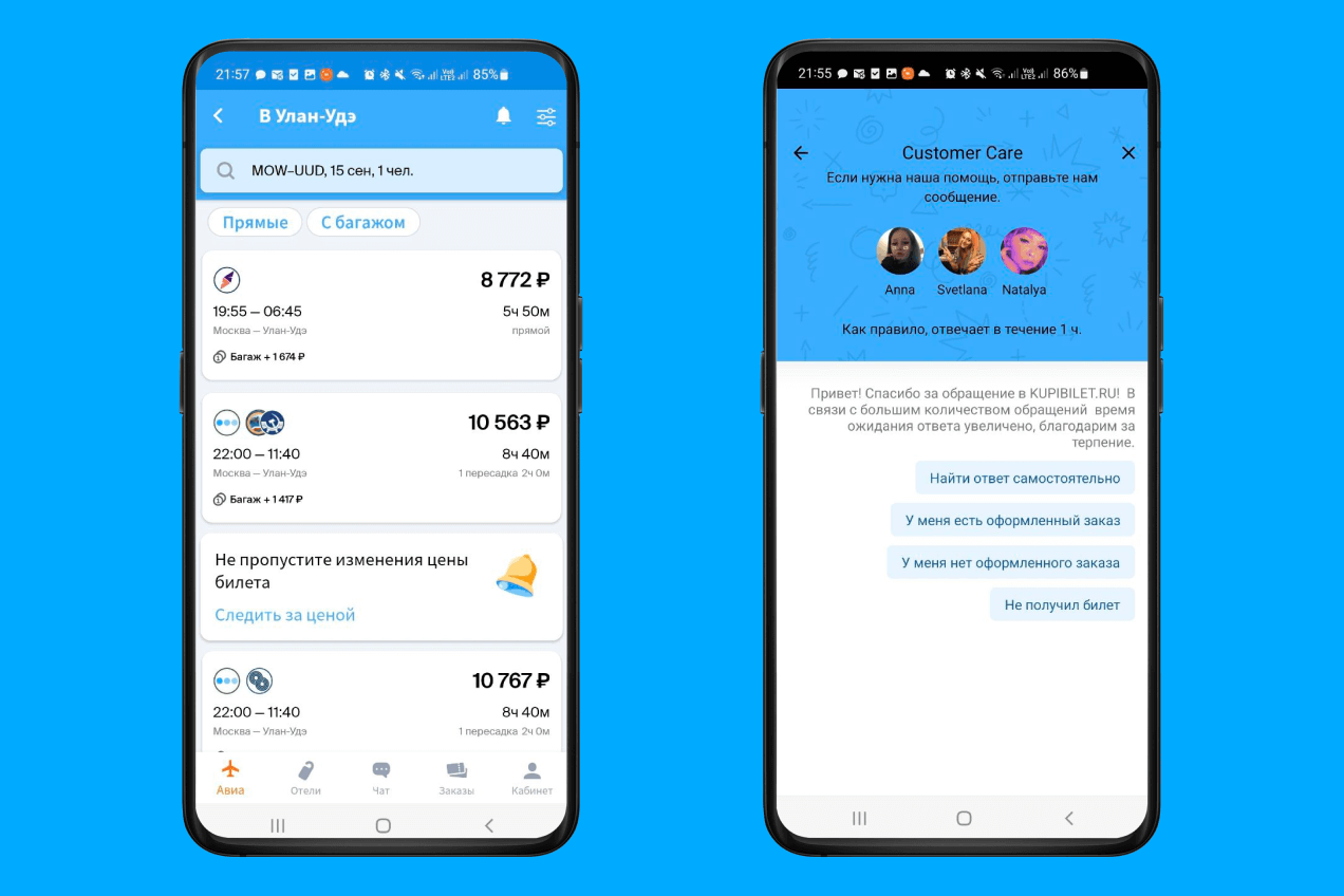 У «Купибилет» есть бесплатный чат службы поддержки, в котором вы можете оперативно (время ответа колеблется от 5 минут до получаса) получить ответ на свой вопрос, что сейчас, когда все быстро меняется, является большим плюсом. Здесь есть и собственная программа лояльности — в ней участвует каждая ваша покупка, и в итоге можно забронировать билет с большой скидкой. Если в дополнение к авиабилетам вы ищете жилье, приложение предложит кэшбэк с бронирования на Booking.com. Постоянно обновляющиеся истории — лайфхаки, советы и мини-путеводители — приятно почитать для вдохновения, даже если планов лететь куда-то у вас нет. В учетной записи можно хранить зашифрованные данные карт для оплаты и данные пассажиров, чтобы оформлять бронирование было удобнее.