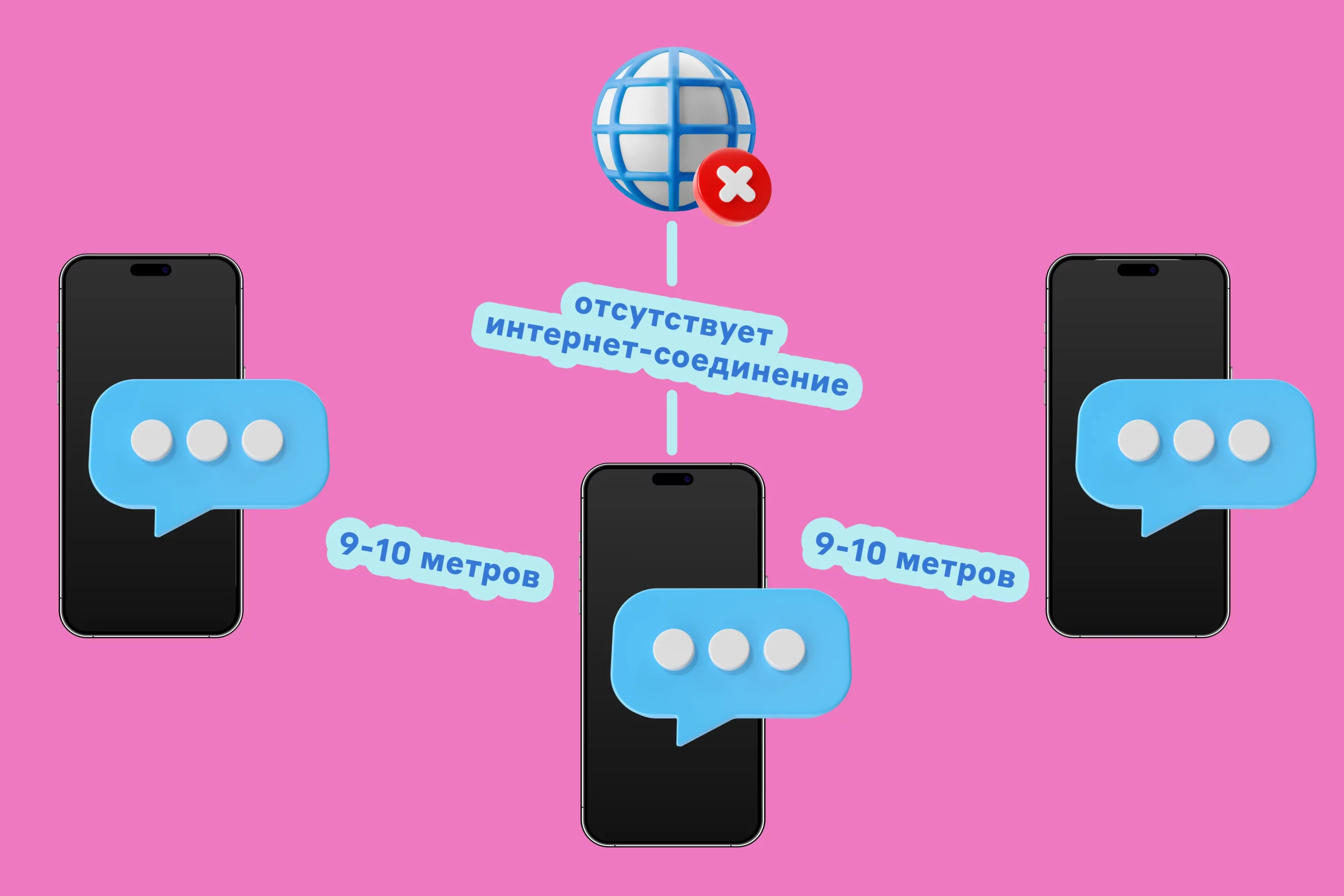 Мессенджеры без интернета работают по принципу «сети между устройствами». Сообщение передается напрямую через Bluetooth или Wi-Fi в пределах примерно 100 м. Если получатель находится дальше, сообщение «прыгает» от телефона к телефону: от абонента, А к пользователю С, а уже потом к адресату В. При этом переписку никто не сможет прочитать — данные зашифрованы и видны только отправителю и получателю.