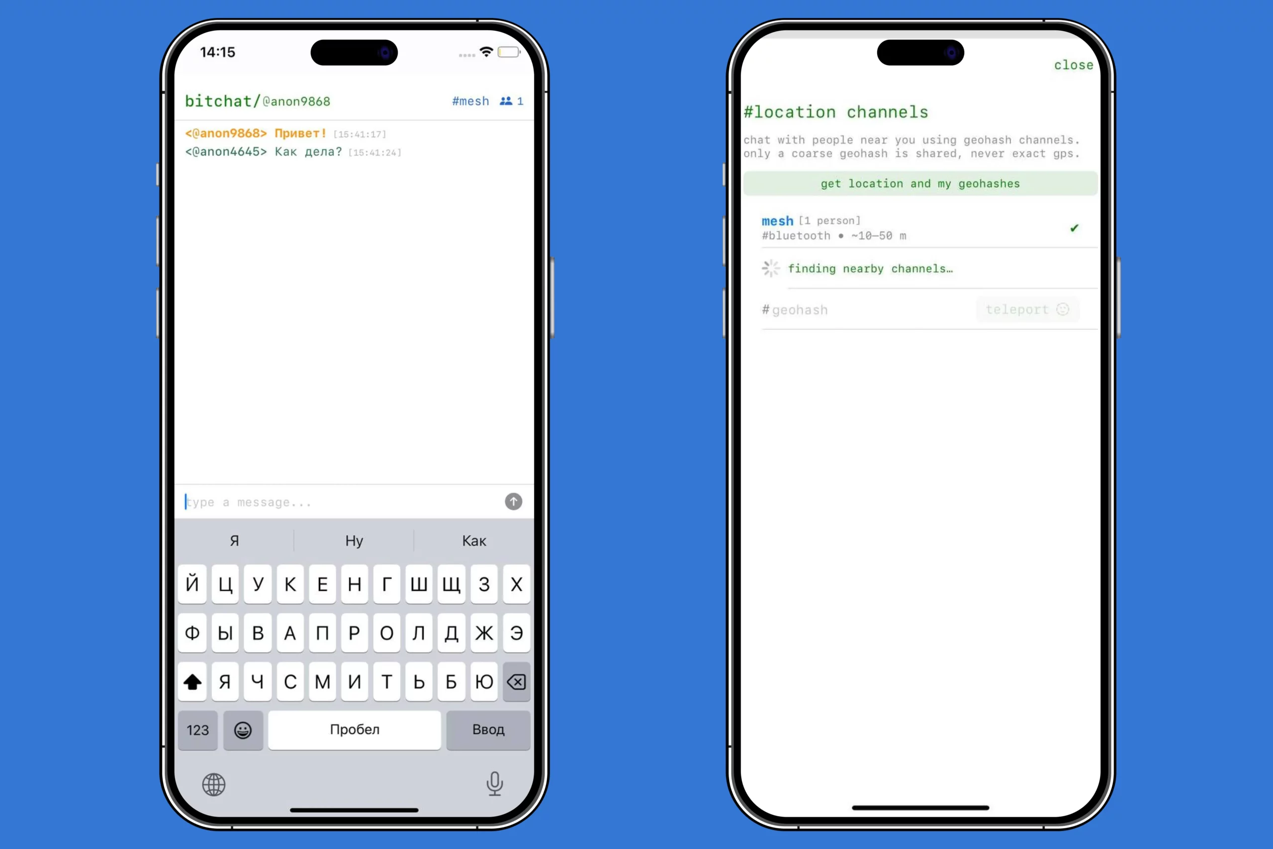 В приложении наиболее удобный механизм поиска: BitChat отображает ближайших юзеров и определяет примерное расстояние до них. После выбора собеседника открывается чат, в котором видно ник и сообщения пользователя.