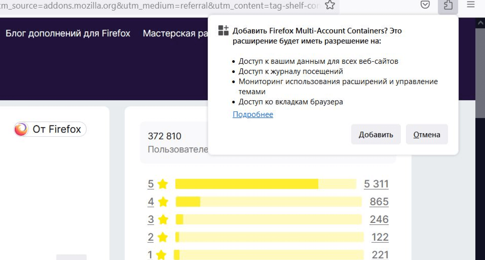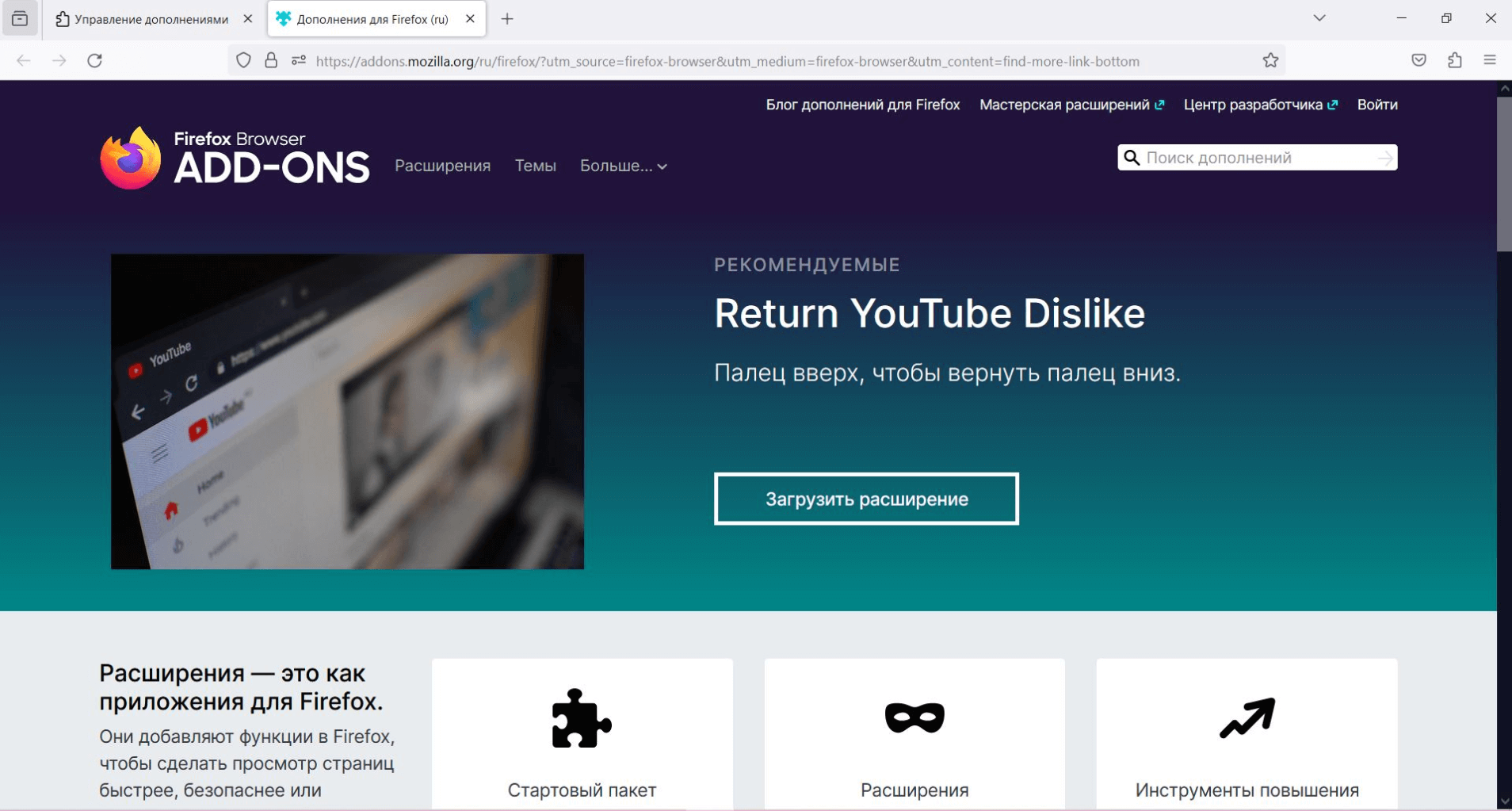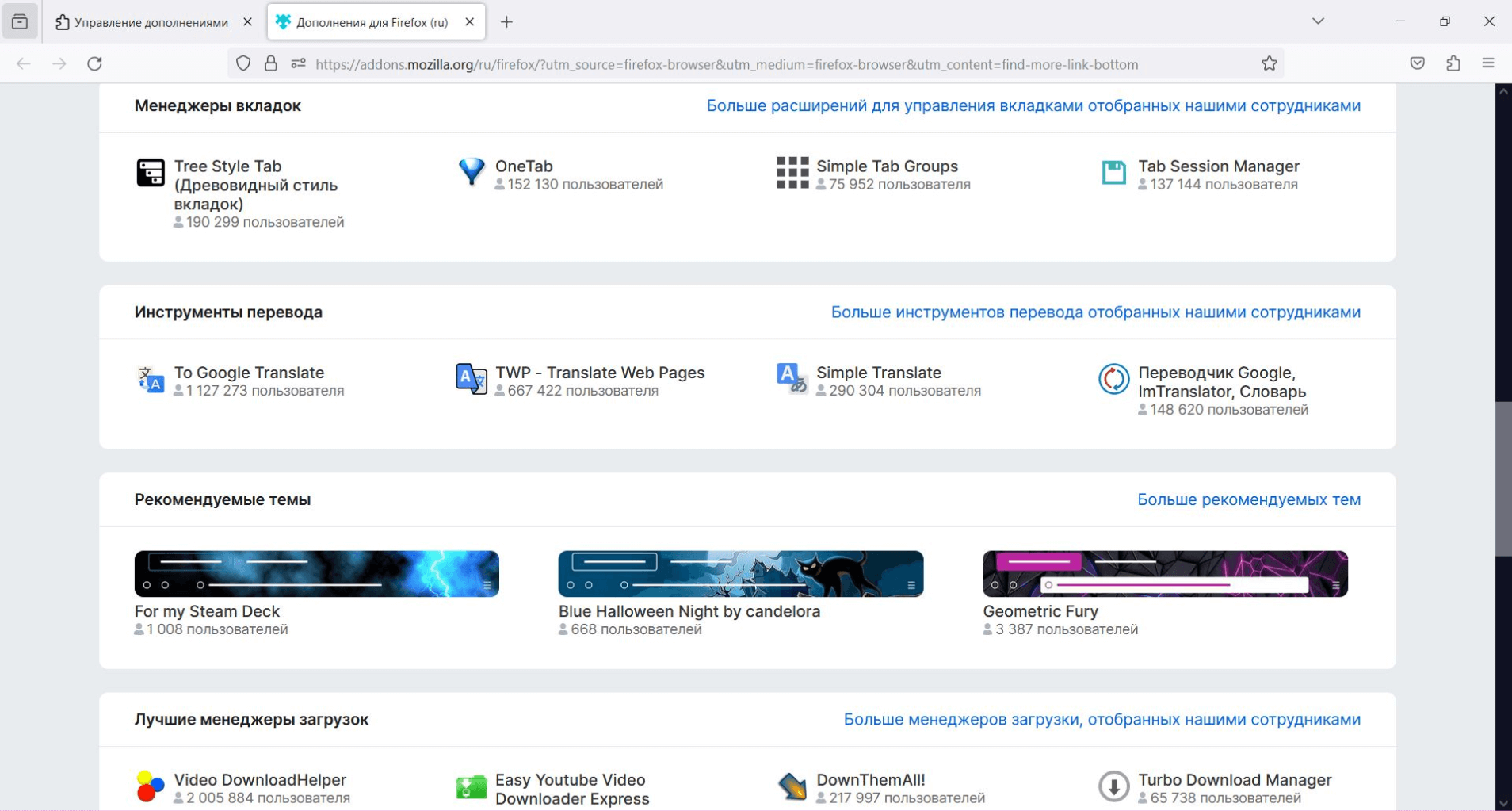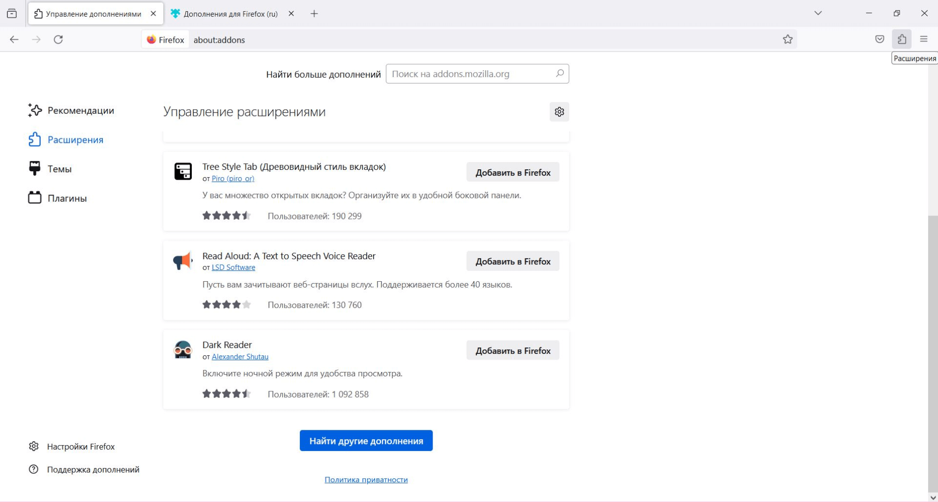 Расширения «Гугл Хром» или «Оперы» несовместимы с этим браузером — у Firefox есть своя библиотека, попасть в которую можно через строчку «Управление расширениями» одноименного меню. Список установленных расширений в Firefox скрывается за кнопкой-пазлом: кликнув на нее, увидите свои расширения, сможете добавить их в основное меню, удалить, настроить доступ — через кнопку с иконкой шестеренки.