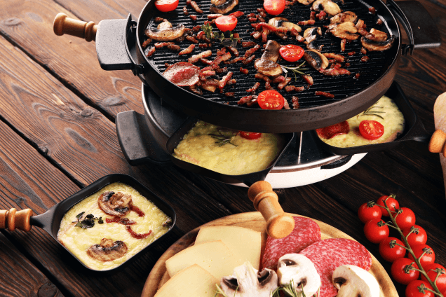 Racler по-французски — «скоблить или скрести», а raclette — сорт жирного и пахучего швейцарского сыра, обладающего выдающимися способностями плавиться. Когда-то давно жители Альп придумали постепенно соскабливать с целых головок, положенных близко к огню или печке, верхний растекающийся и слегка тягучий слой — почти соус, — и есть вместе с печеным картофелем, хлебом или мясом. Современная электрическая раклетница — наследница классических и ранних угольных устройств для плавления сырных головок в тавернах и более поздних газовых и электрических домашних вариантов. Компактные и продуманные, они заменяют духовку и сковородку одновременно — и сыр, и гарниры к нему готовятся вместе и ровно столько, сколько хочется продолжать ужин.