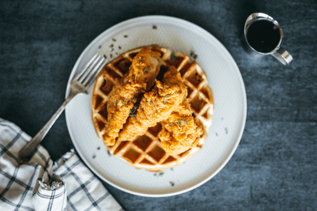Подавать вафли теплыми с цыпленком (или другой жареной птицей) и кленовым сиропом.