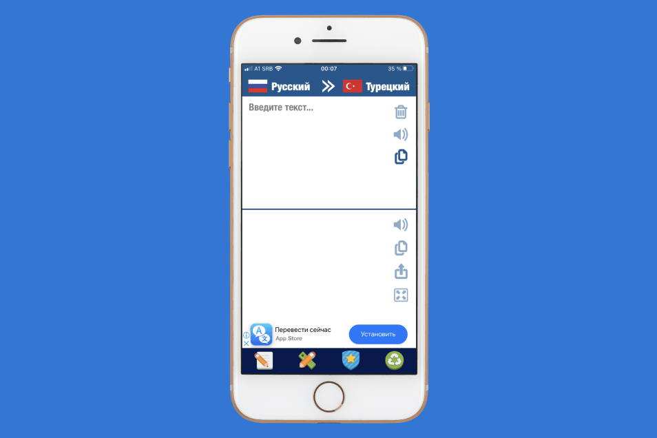 Это не только русско-турецкий переводчик и разговорник — можно выбрать любой другой язык для перевода на турецкий. Как обещает разработчик, после покупки версии Pro за 749 рублей отключатся все ограничения и реклама, откроется возможность ввода текста голосом. Приложение автоматически записывает историю переводов, что позволяет сэкономить время.