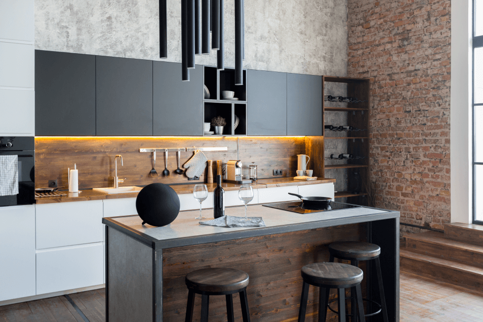 В лофте или современном модульном доме, где кухни чаще всего объединены с гостиной или другой общей зоной, компактный и лаконичный гарнитур с аккуратными закрытыми системами хранения нижних и навесных шкафов быстро решит вопрос с организацией комфортного рабочего места. Затем его можно легко дополнить самой разной оригинальной дизайнерской мебелью — например, большим деревянным обеденным столом из декоративного спила (слэба) с металлическими скамейками или пластиковыми стульями в духе легендарных Eames. Или даже коллекцией эклектичной винтажной мебели разных эпох.